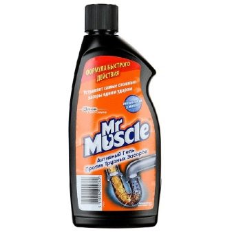 - "Mister Muscle". The main advantage of this cleaning agent is the instant effect of the drug, it will cope with minor blockages in a few minutes. This is due to the fact that the composition has a large number of acids and alkalis. The dissolution of sparingly soluble blockages takes about 2 hours. The drug is available in the form of a gel or powder.