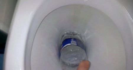 - the bottle is lowered with the cut end into the hole in the toilet bowl as far as possible;