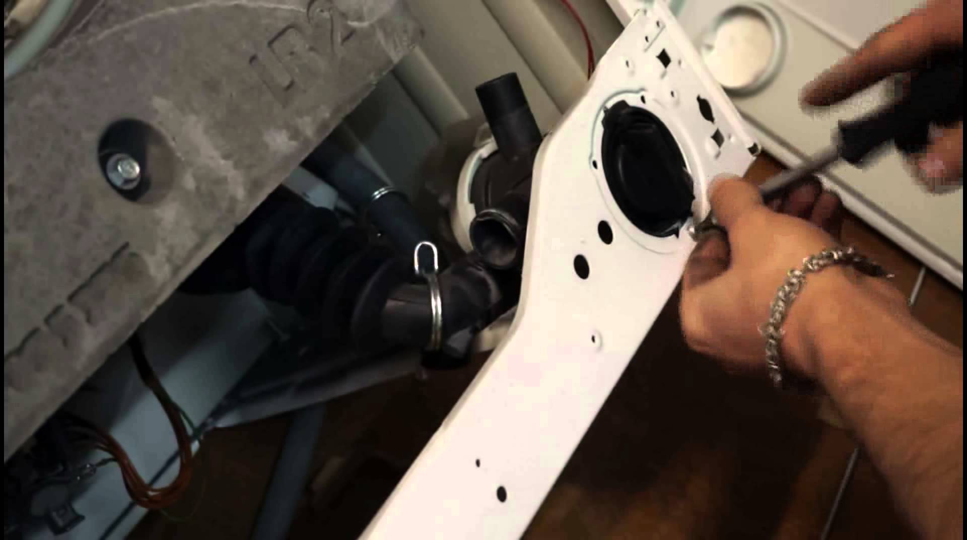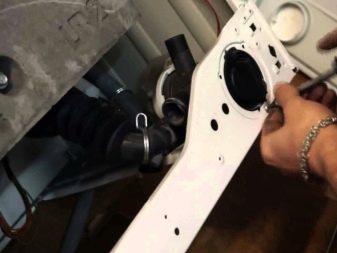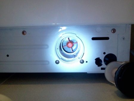 - There are situations when the drain filter element is too dirty or there is a lot of scale on it. In such cases, it is most likely that it will not be possible to unscrew and remove it in the manner described above. You can try using a screwdriver to unscrew the entire drain pump. The machine must be turned on its side, remove the lower protective panel. At the bottom of the bottom of the case you will see a drain pump, which is located just behind the filter. Having unscrewed the pump, you can remove the filter not from the outside, but from the inside of the housing.