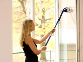 Thanks to the long handle, this model ensures safety in use at any height of the balcony. It copes well with the outer and inner side of the window, helps to flush even the most inaccessible places. Such a model is indispensable for washing front windows, the handle length reaches two meters thanks to a telescopic device. When extending to the desired length of the handle is fixed.