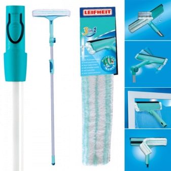 German manufacturer "Leifheit". Mop for washing windows from this company 3 in 1 like any housewife. This assistant is able to clean the mirror, glass surfaces and the frames of the glass unit. Change the nozzle and lightly brush the dust off the cabinet, it will wash both the floor and the ceiling. In addition to these, there are other benefits: