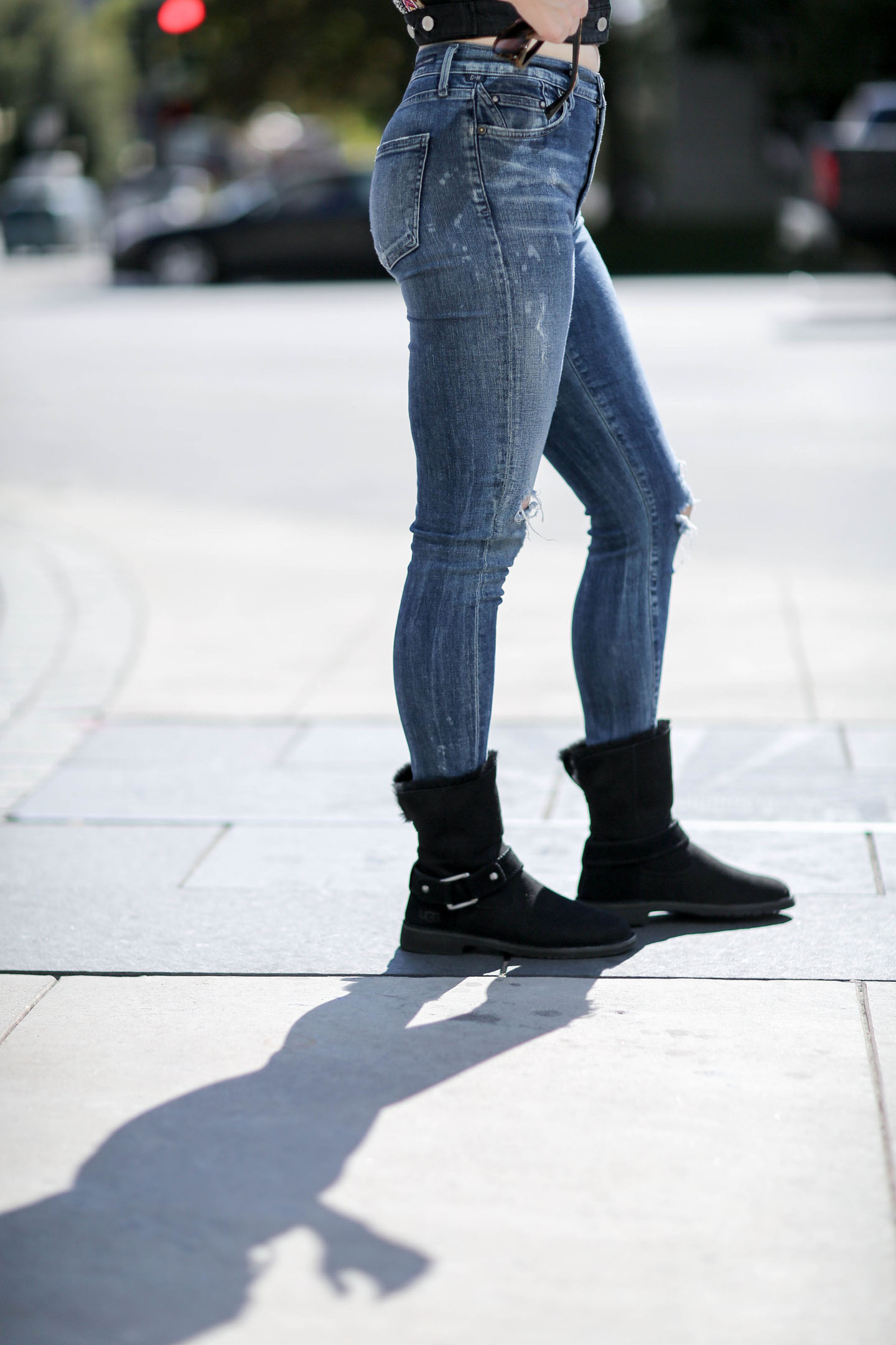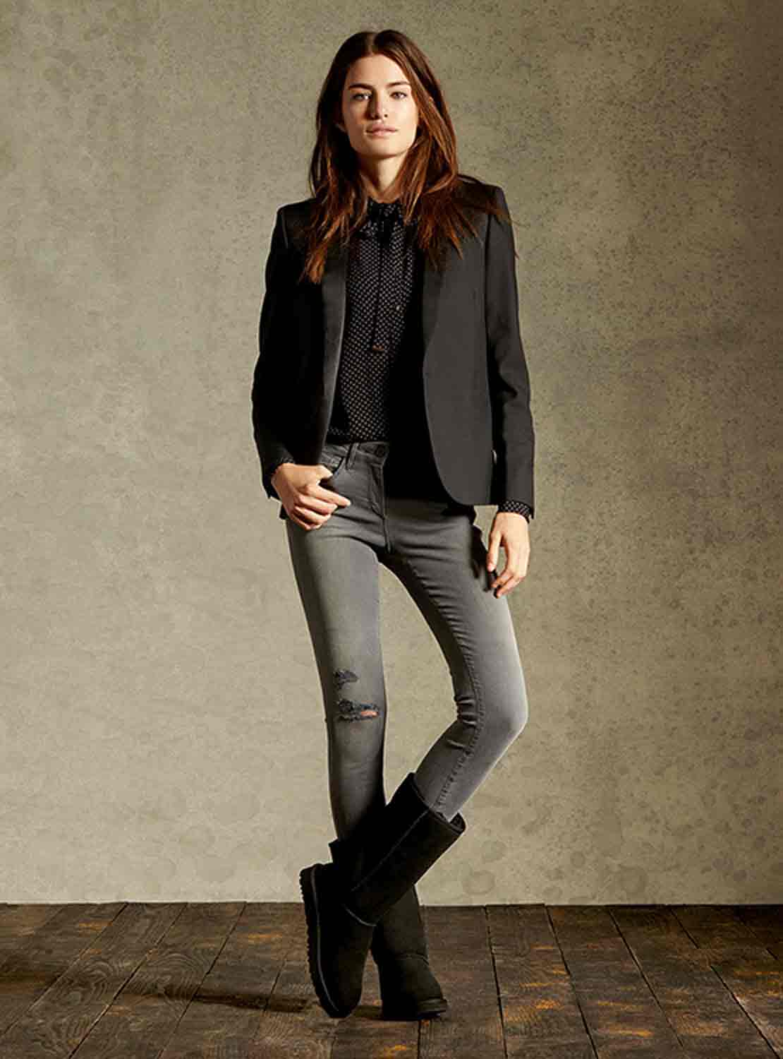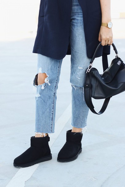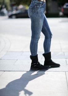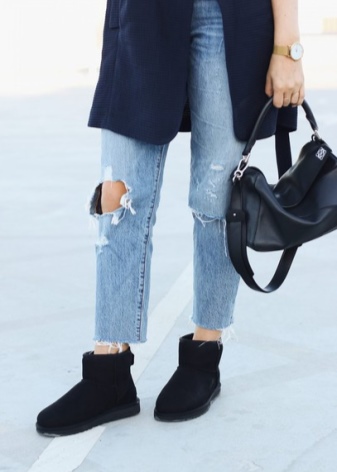 Uggs look harmonious with regular jeans. This combination in the style of casual is one of the most successful. Jeans can choose a narrowed or straight cut. It is recommended to fill them in shoes.