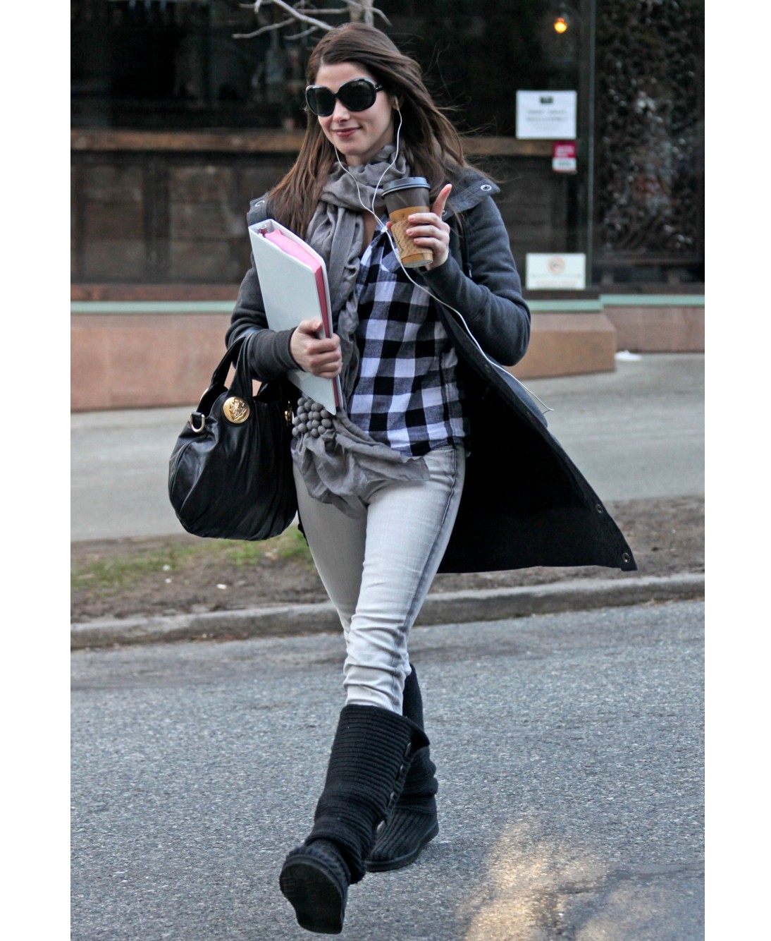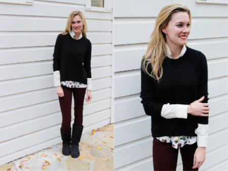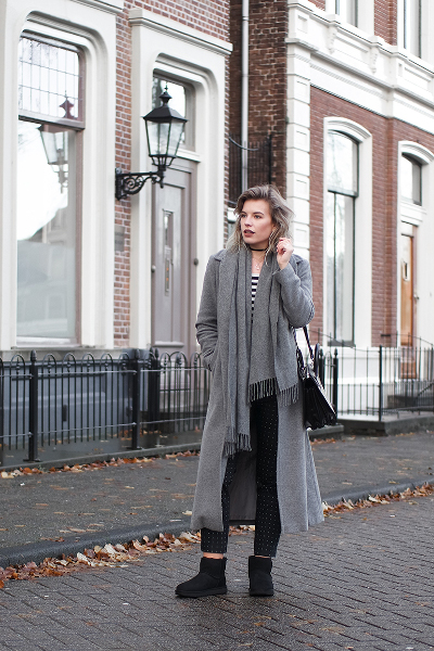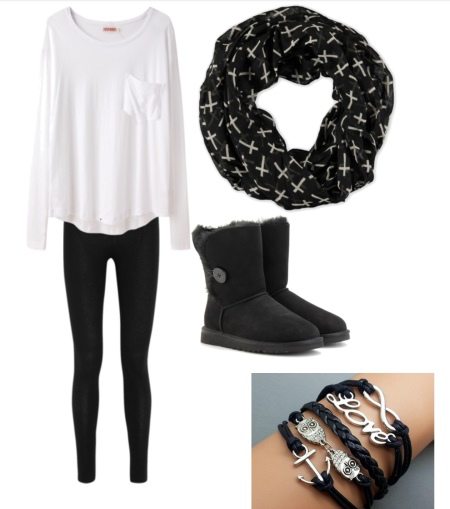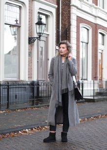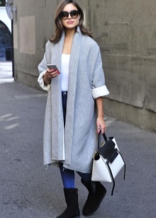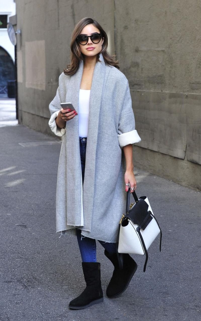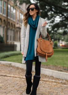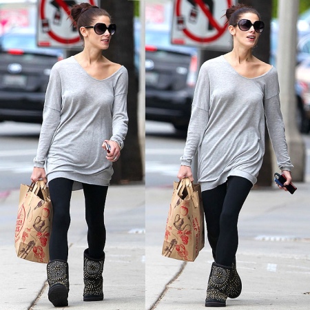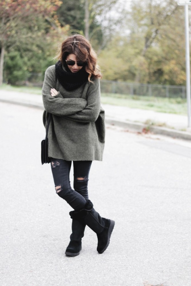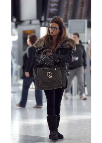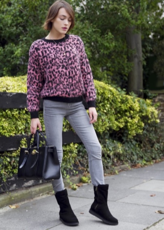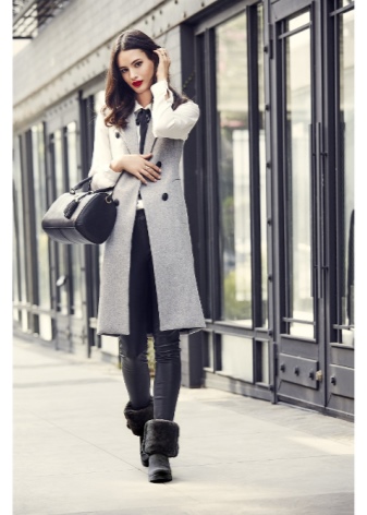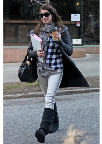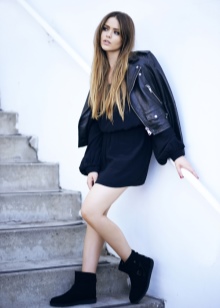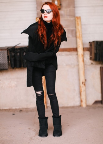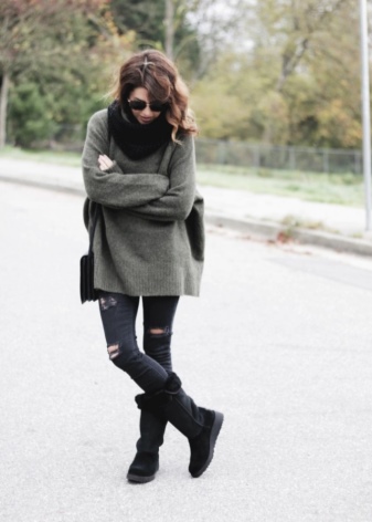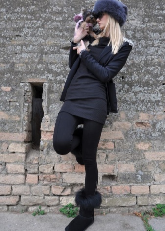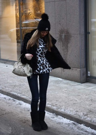 Black uggs look great with tight leggings. The thing can be monophonic or decorated with various patterns and prints. This combination is designed for slender fashionistas. Owners of a full figure from such an ensemble should be abandoned, as it will draw attention to the shortcomings.