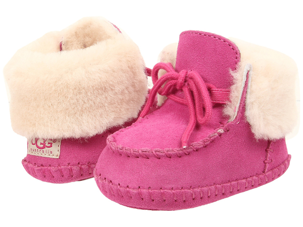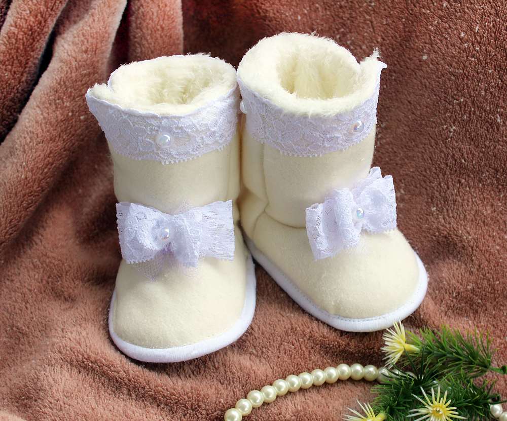 Booties need to tie, they can crawl, the child will be uncomfortable or even cold. Uggs in this regard are much more convenient and comfortable even for newborn children. Usually, the upper part of boots for babies is made of natural material, for example, suede, and fleece, bike or sheepskin is used as a heater.
