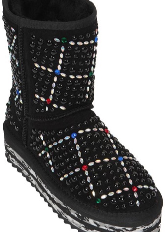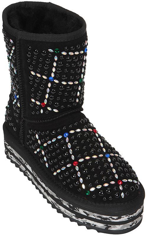 Stylish models from natural suede from the brand Verendina will be the perfect solution for a bold girl. Uggs are embroidered with round, oval beads and colored rhinestones. The dense relief platform is decorated with a monochrome camouflage pattern.