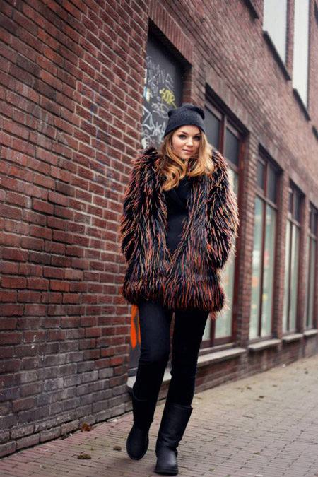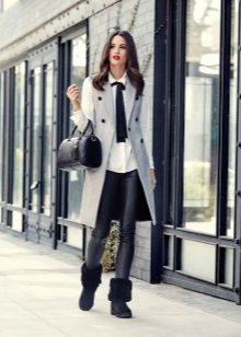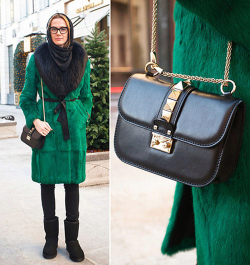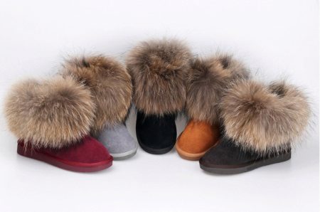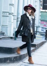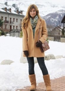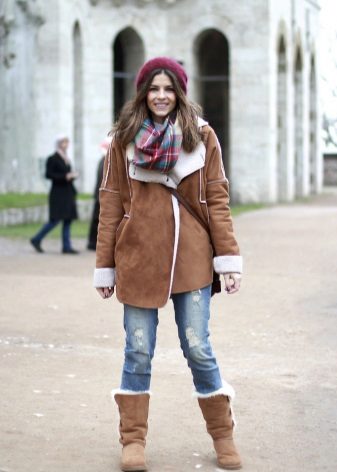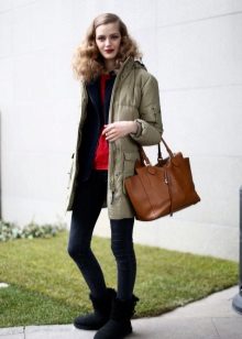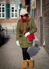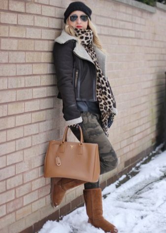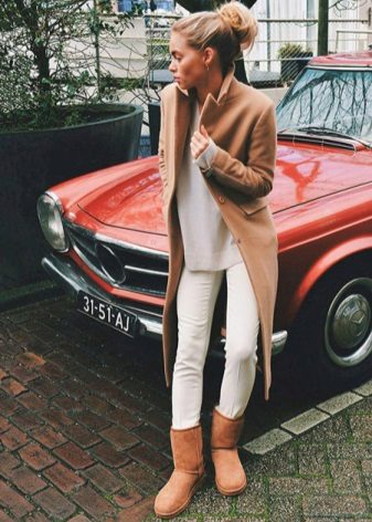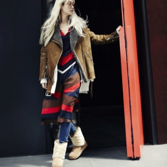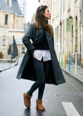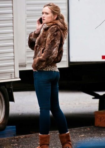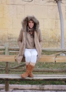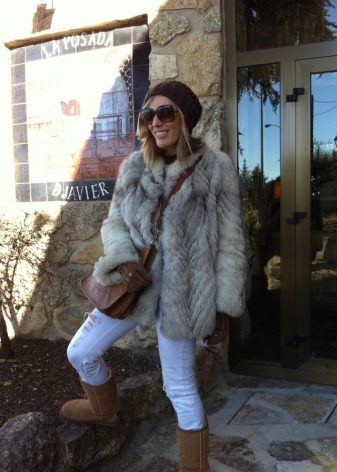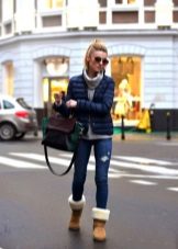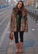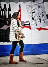Few stylists will advise wearing uggs for a long fur coat or sheepskin coat. Uggs in combination with a long coat of sable or mink is considered a move. Look at the colored, short and voluminous coats. Uggs are quite suitable for them. In combination with modern models of fur coats and supplemented jeans or leather pants, uggs look quite harmonious.