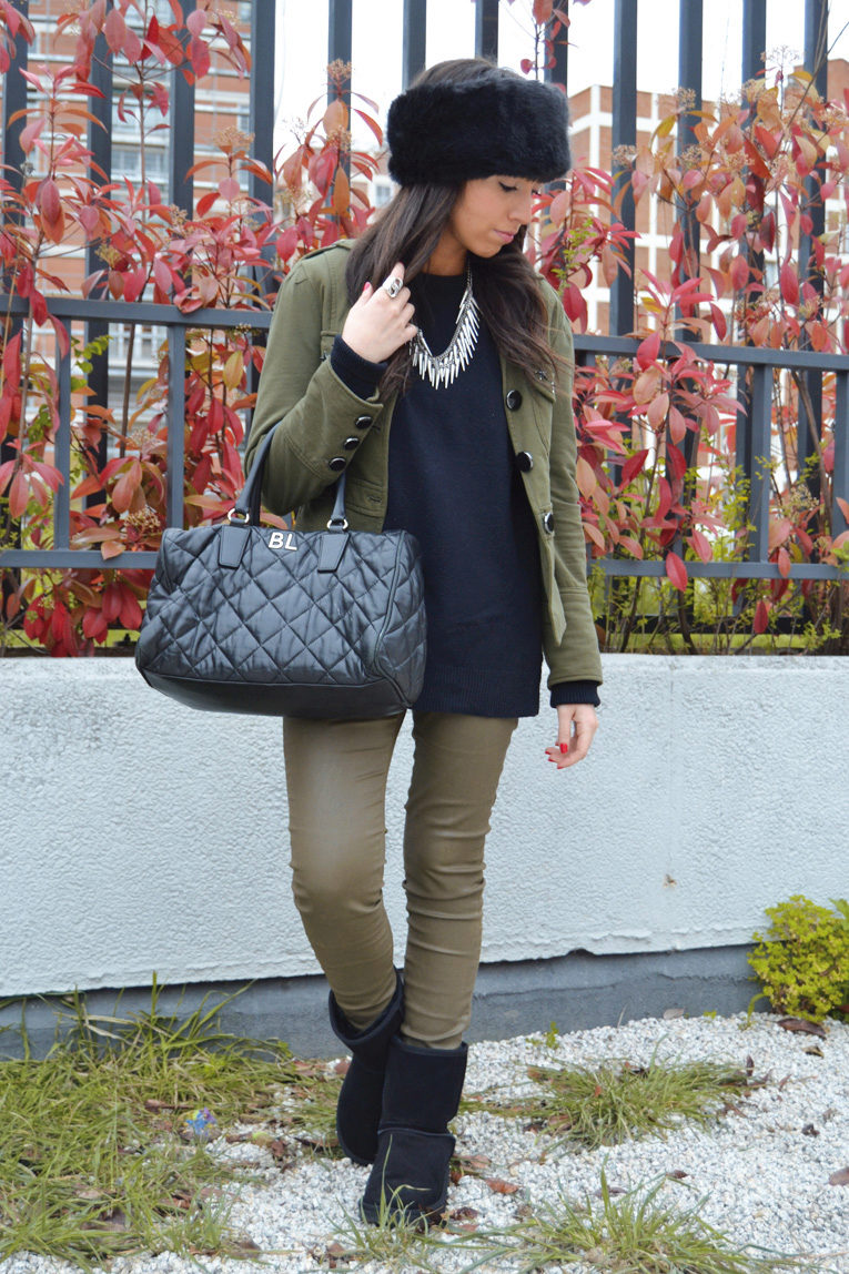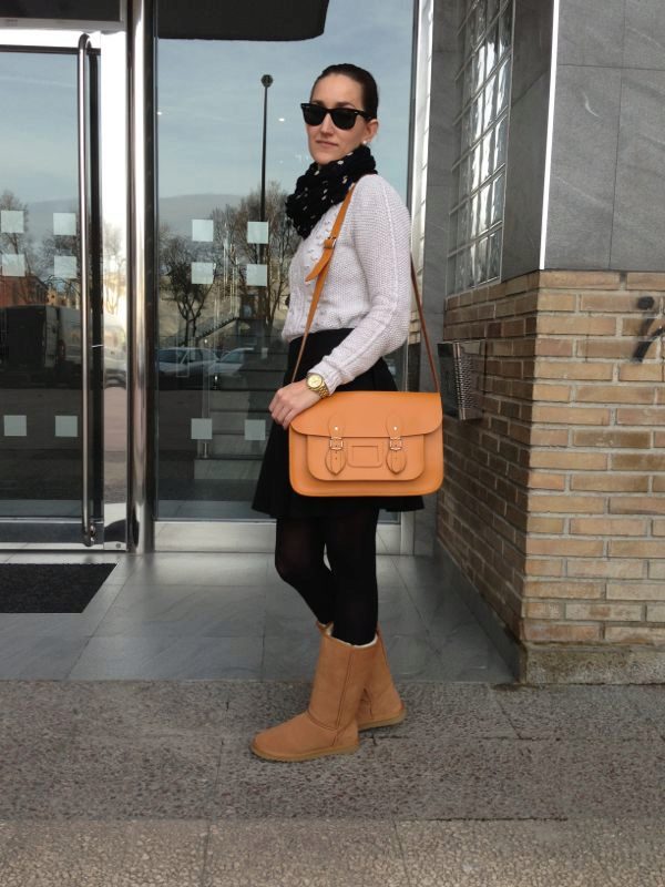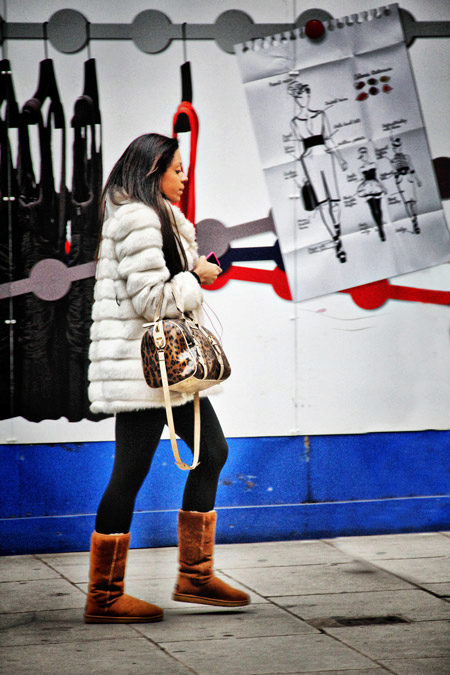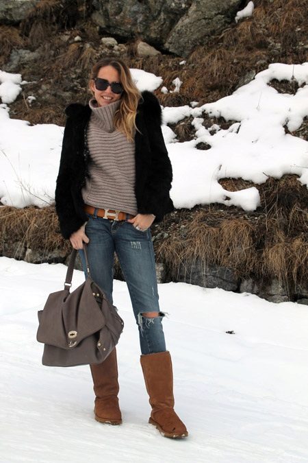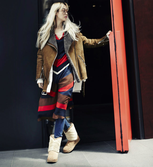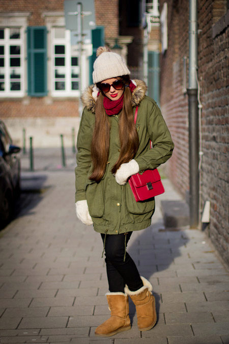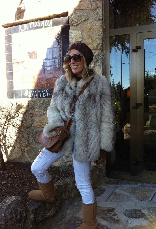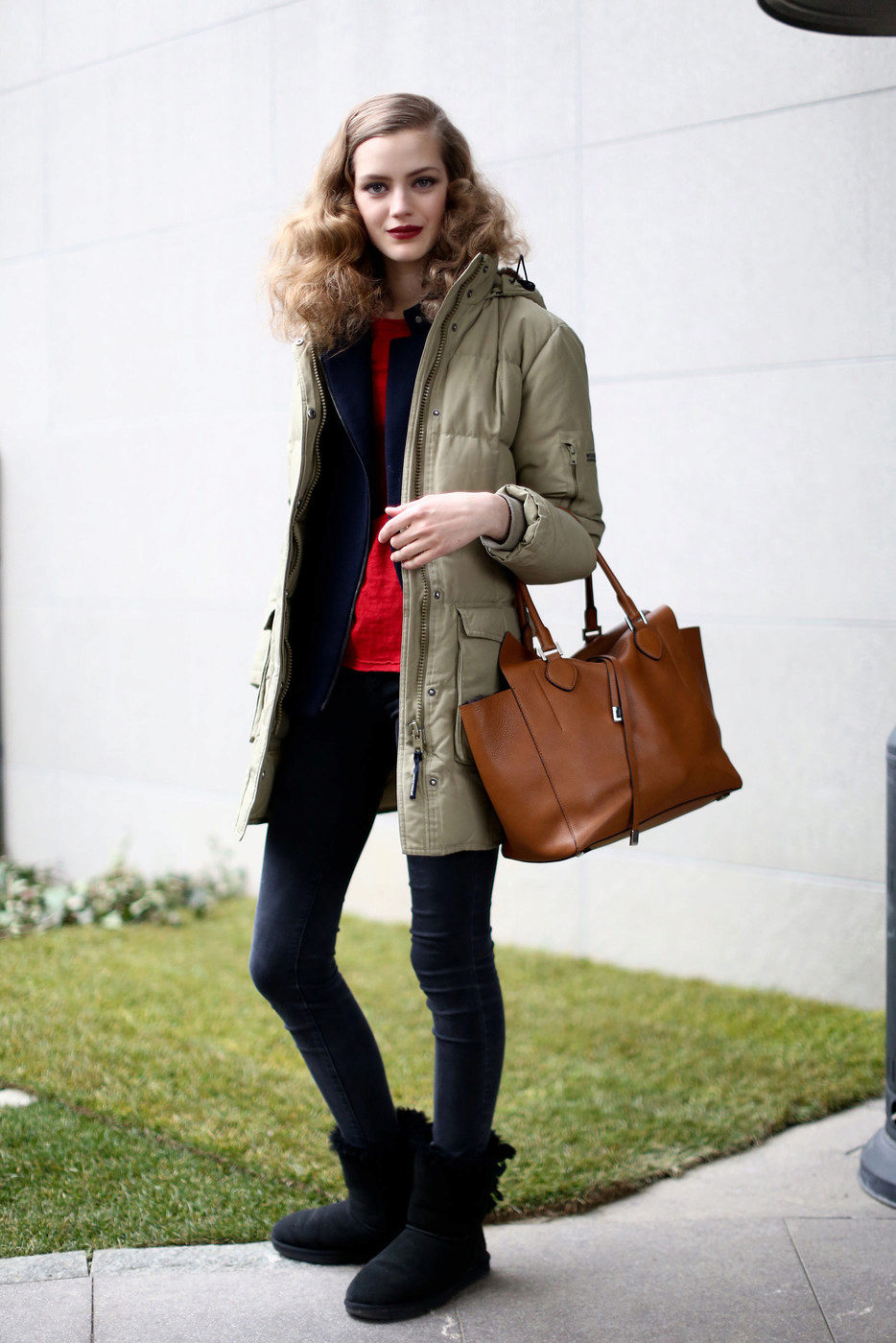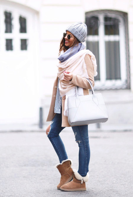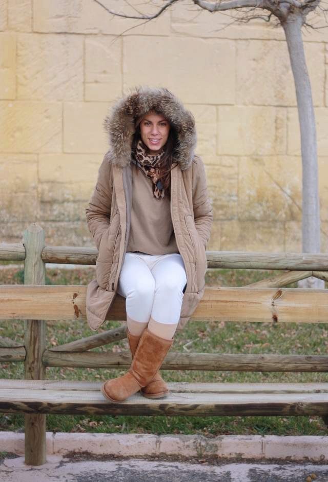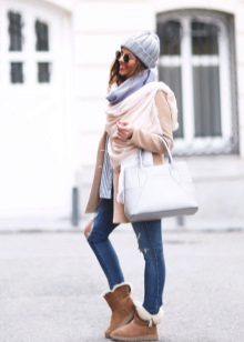 Beige uggs, combined with the same options as the brown models. The only thing that can be added to beige uggam is cropped jackets and black sheepskin coats.