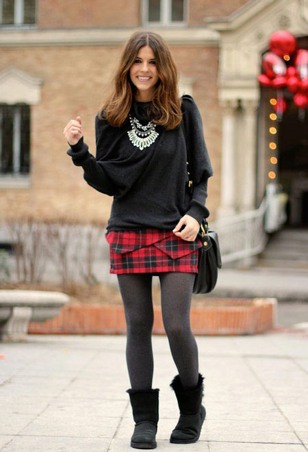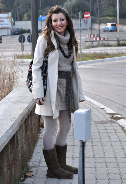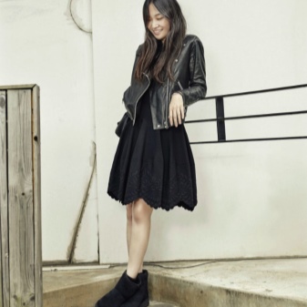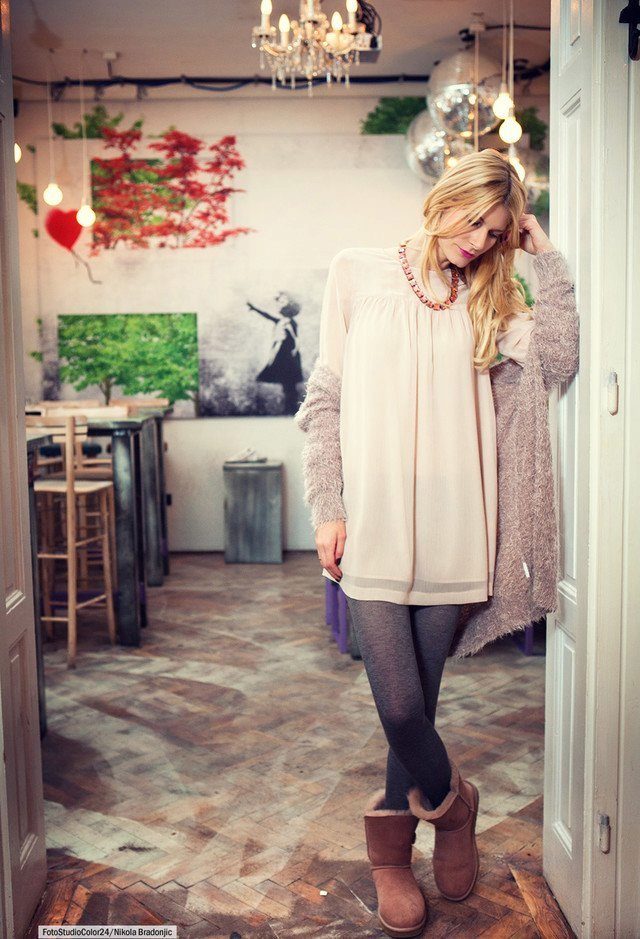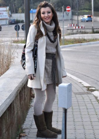 When choosing dresses for such shoes, it is best to stop your choice on dresses made of wool or knitwear in combination with plain tights or leggings. Tights can be kept in the same style with uggs.