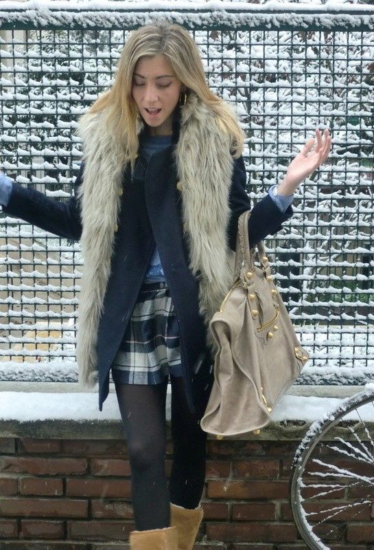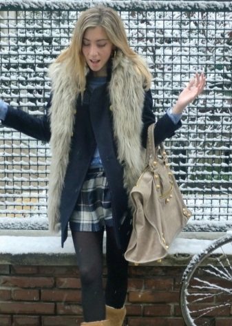 Skirts will be able to replace shorts from dense fabrics. Many women of fashion very much like to combine shorts with uggs. The best option can be a combination of shorts with short jackets and a fur vest. Well, if such a set is sustained in the same colors. But the tights pick a different color and always monochromatic.