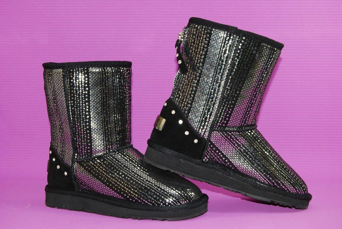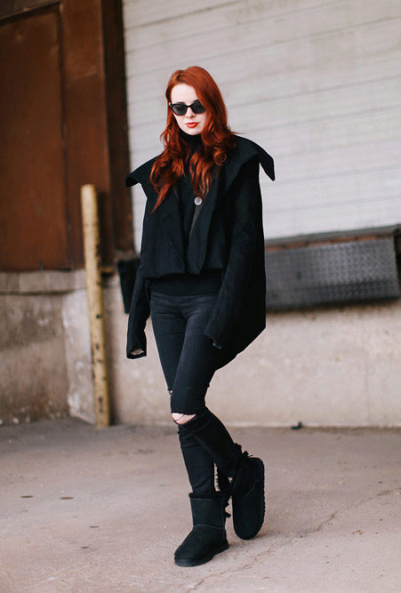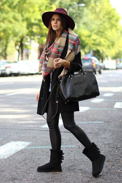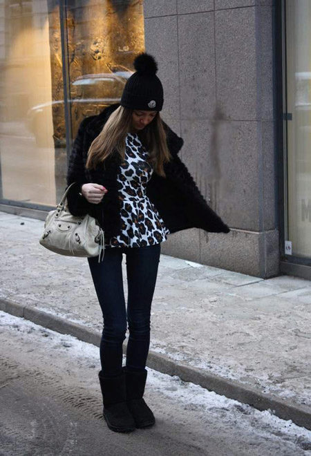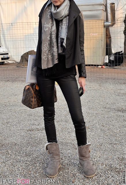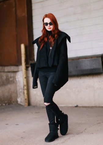 Black uggs are versatile. They can be combined with almost any style and texture of clothing. Stylists recommend combining black and blue uggs with jeans and down jackets to match. Also, the entire image can be sustained in a gray-black tones and complemented by a bright element.