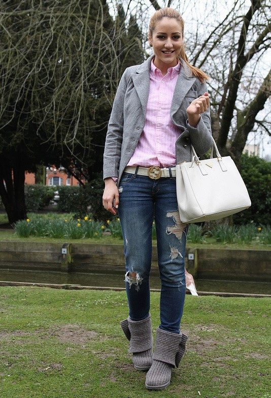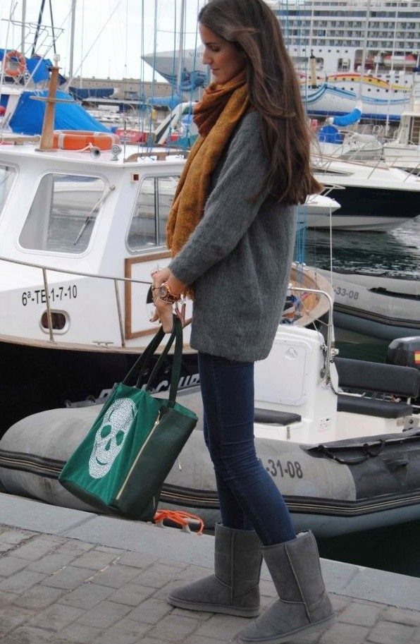 For gray boots you can use combinations with red, pink, blue and black. Also, gray uggs are suitable for romantic style, blue and pink shades.