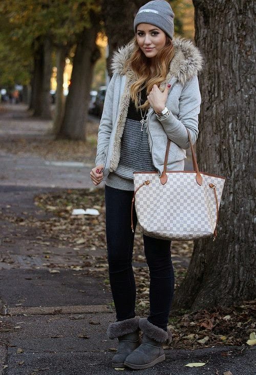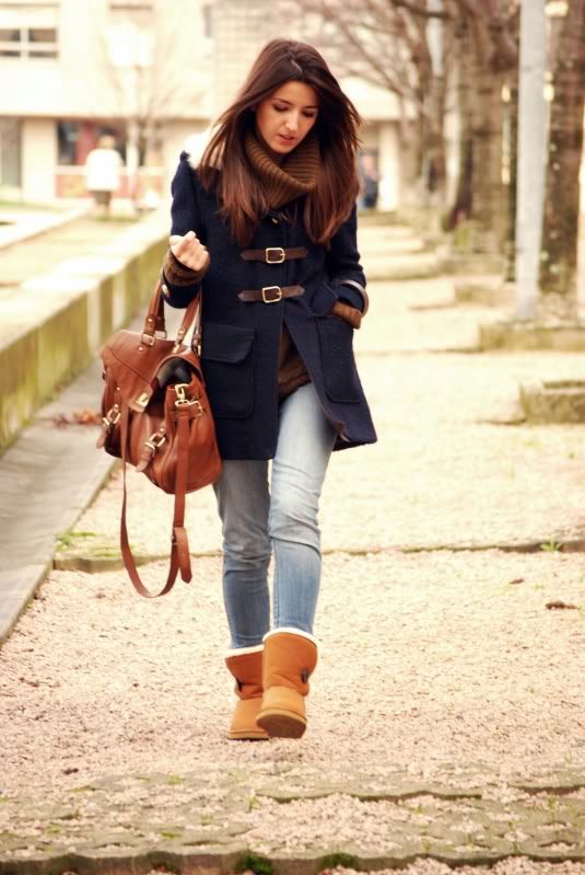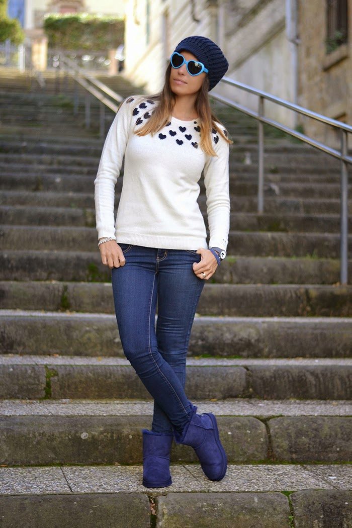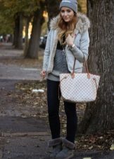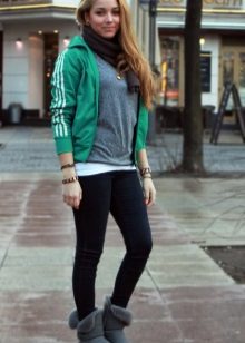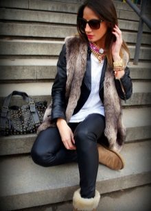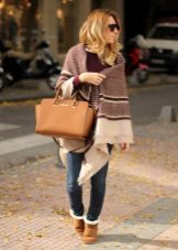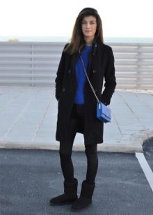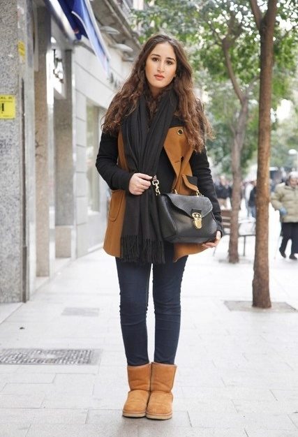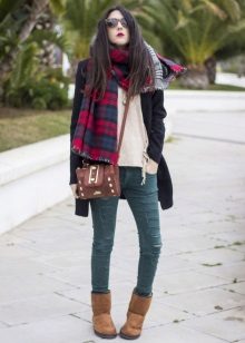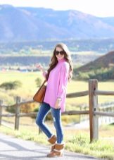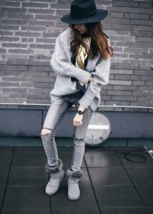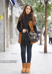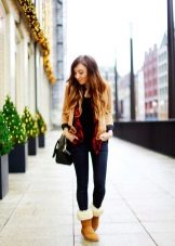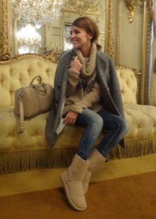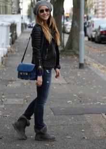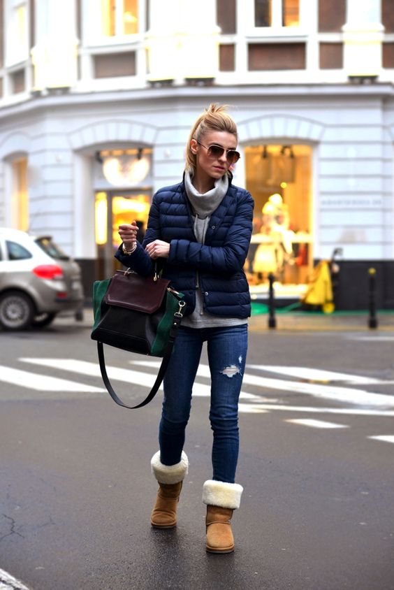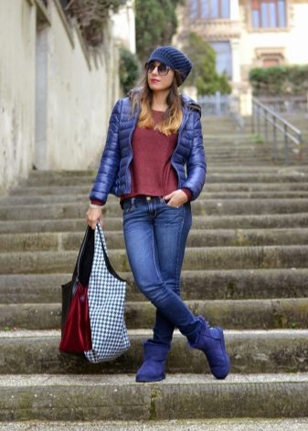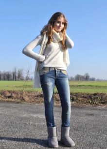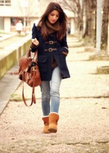 Uggs with fur can be safely combined with skinny jeans. To emphasize the beauty of shoes, jeans must be tucked into boots, otherwise you simply hide fur cuffs from others. From flared cut should be abandoned.
