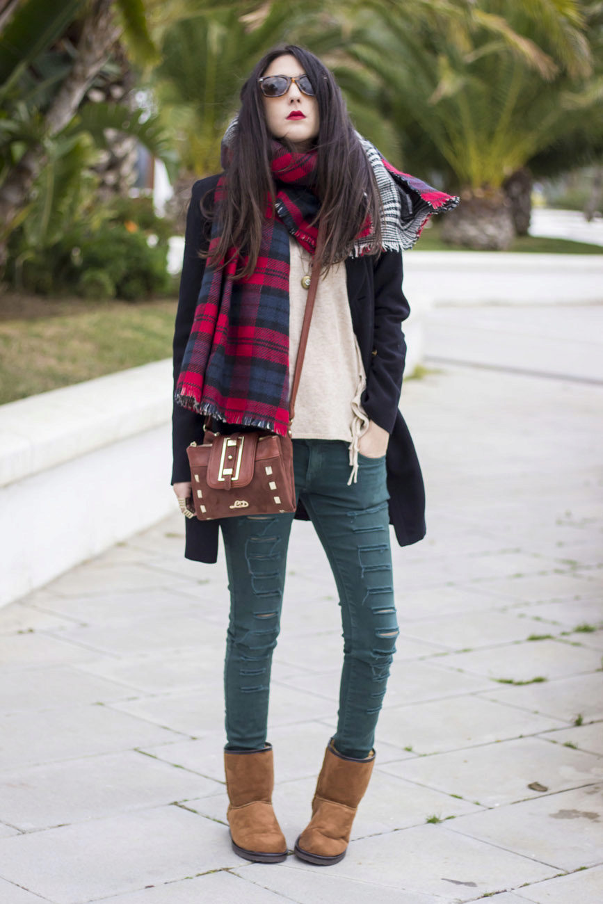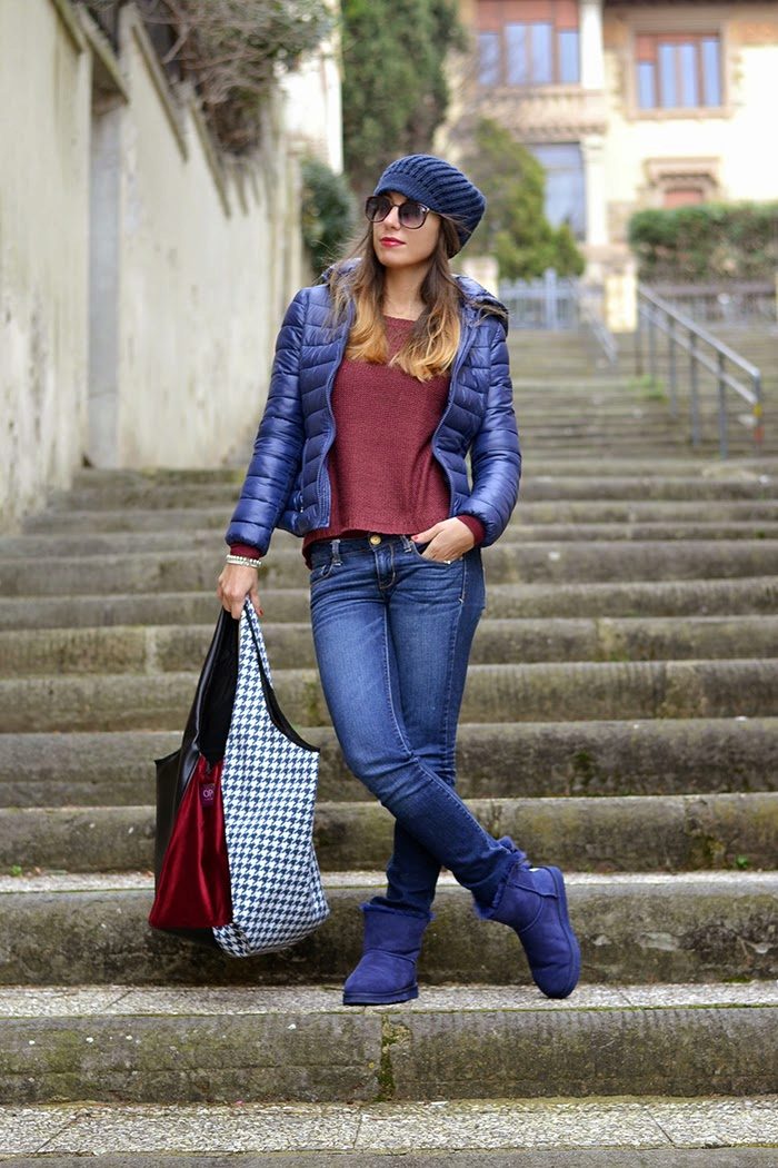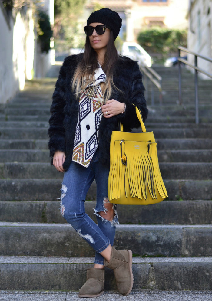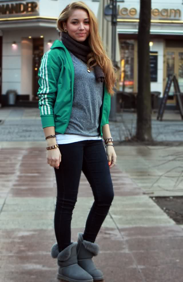 Uggs with fur can be safely combined with skinny jeans. To emphasize the beauty of shoes, jeans must be tucked into boots, otherwise you simply hide fur cuffs from others. From flared cut should be abandoned.