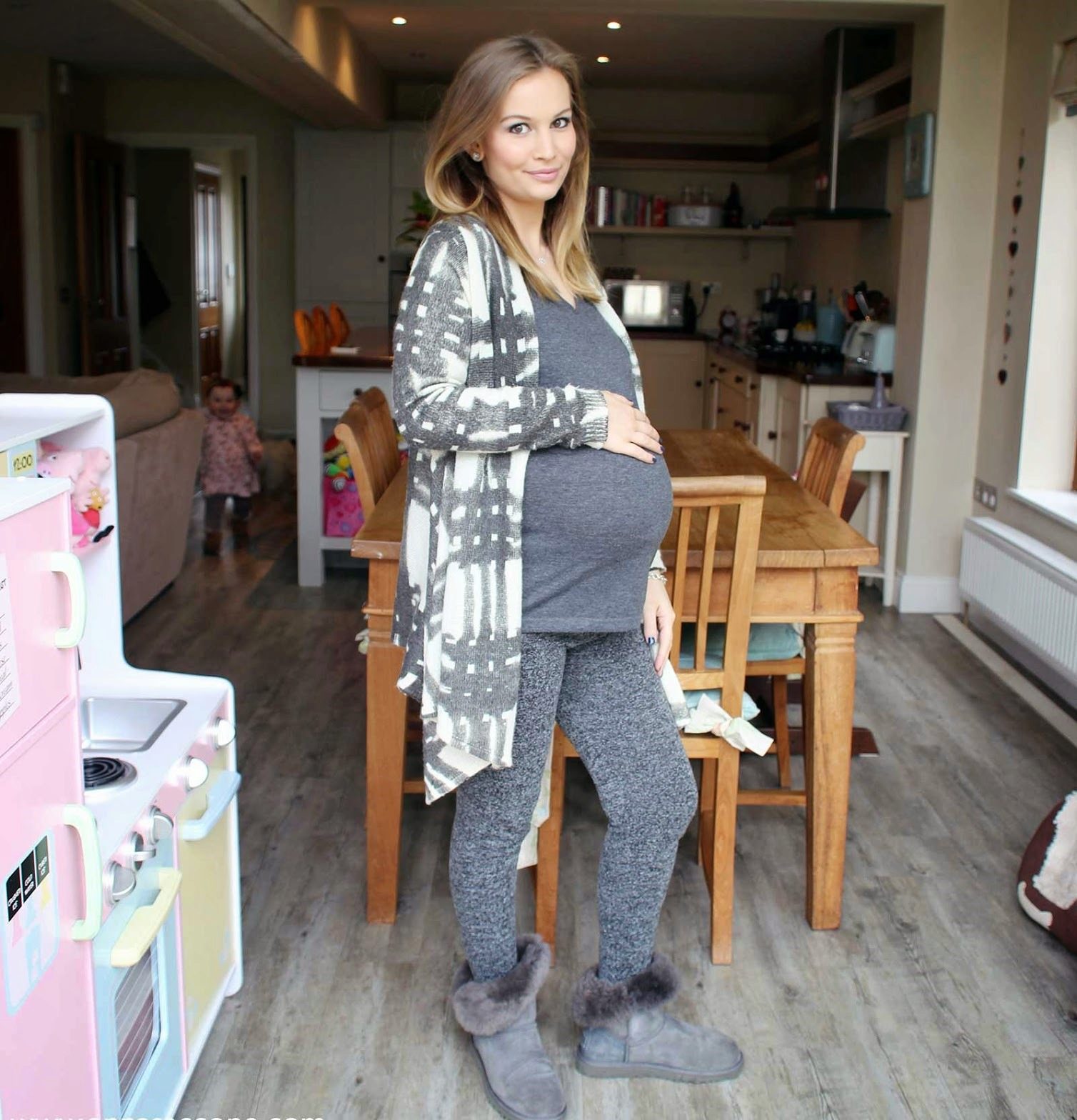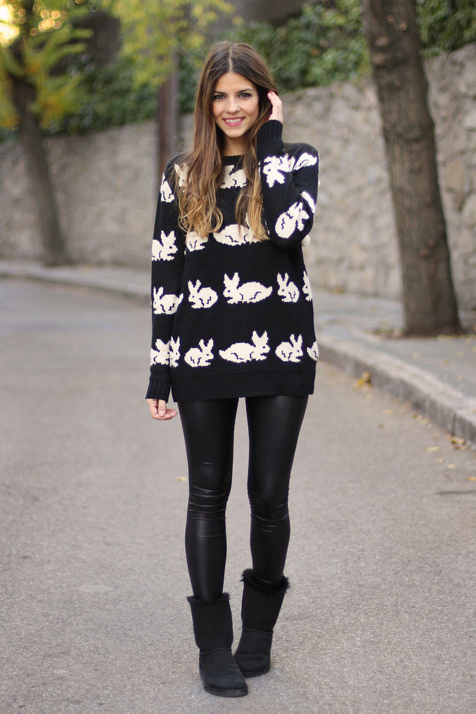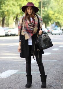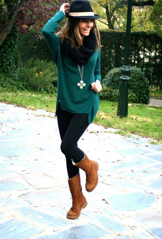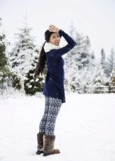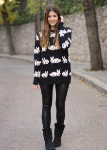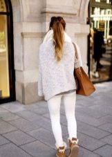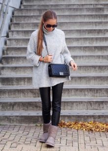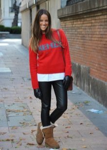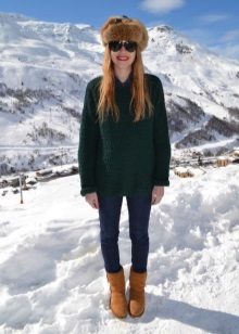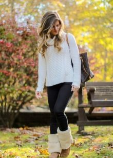 To create a harmonious ensemble for the top, a sweatshirt, a tunic or a free cut sweater is better suited. When choosing outerwear a quilted jacket or down jacket is ideal. A fur coat looks tasteless and ridiculous with this shoe. Remember that the fur on the jacket and shoes must match, at least in color.
