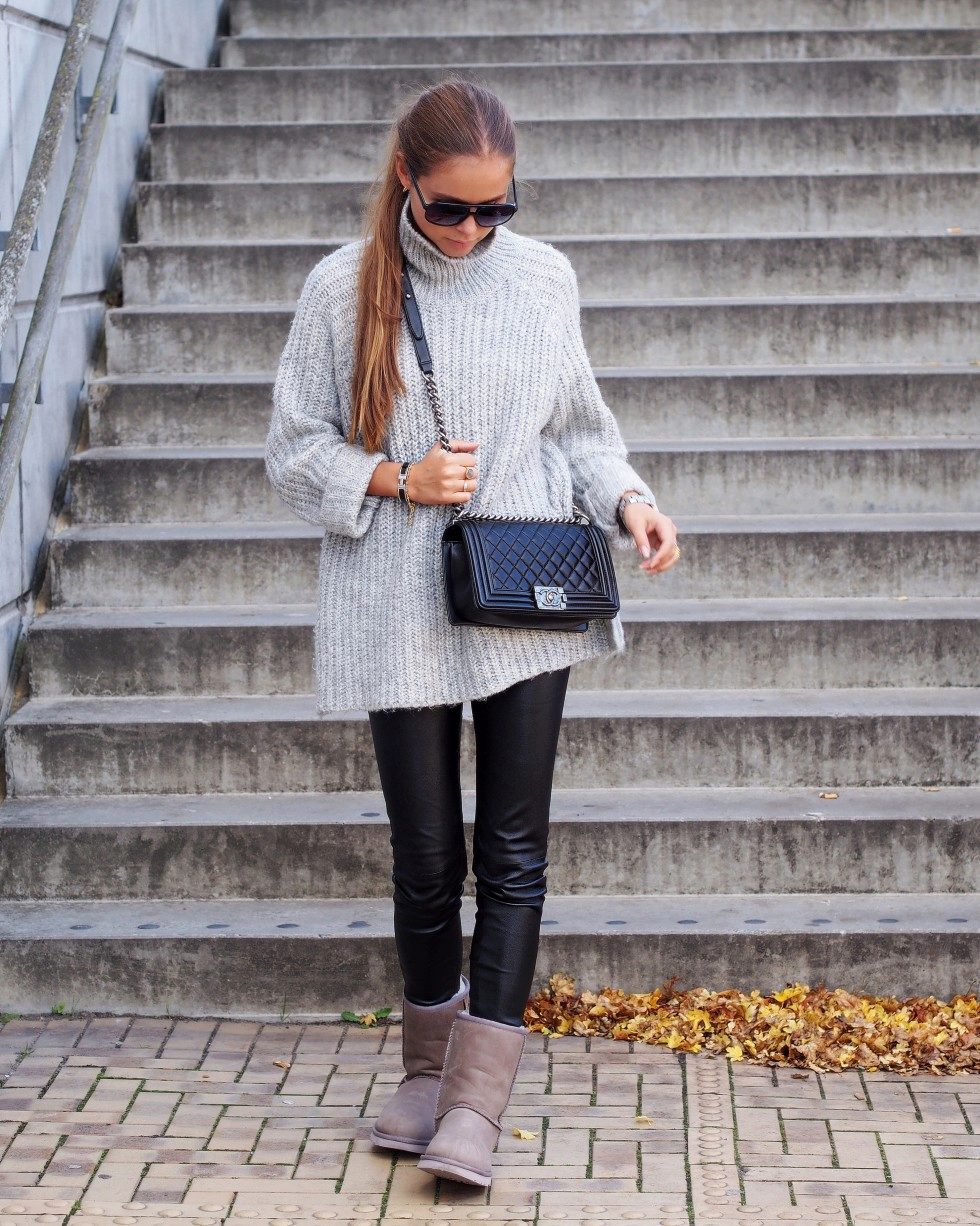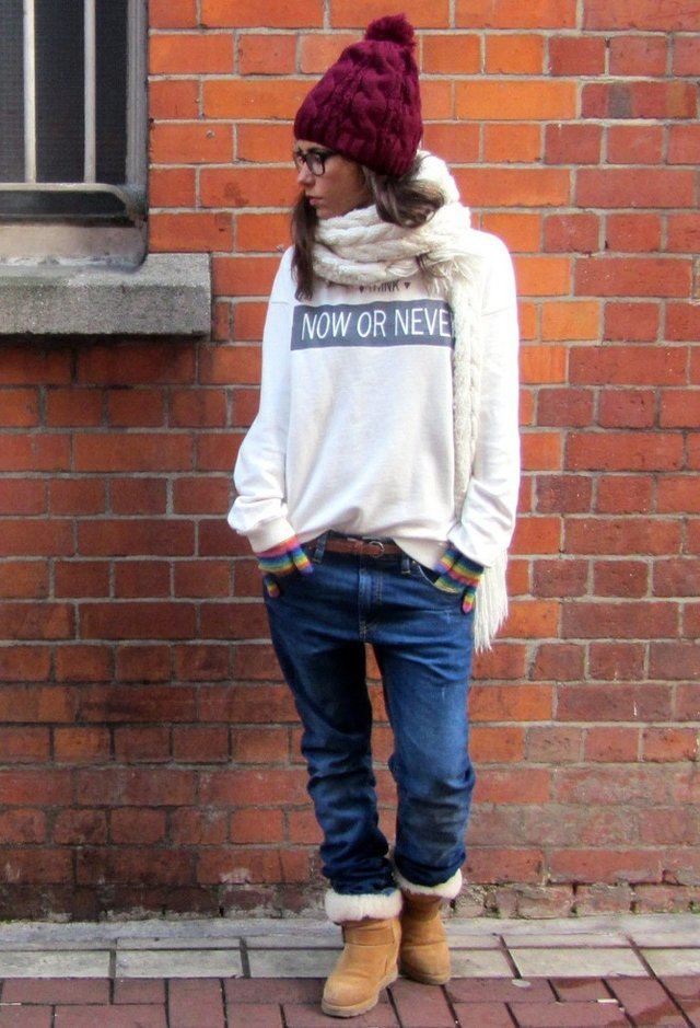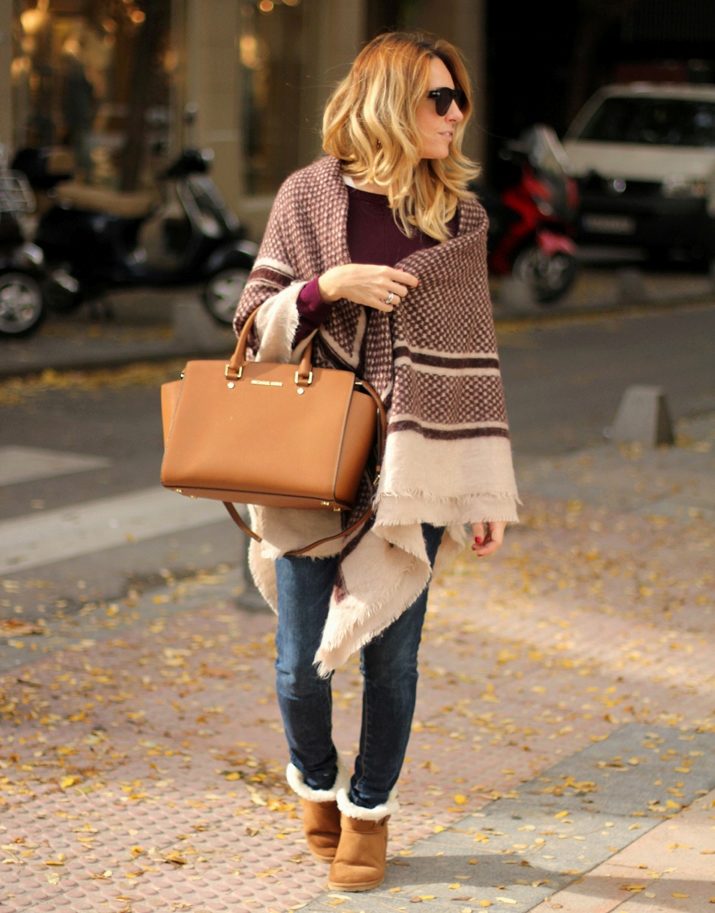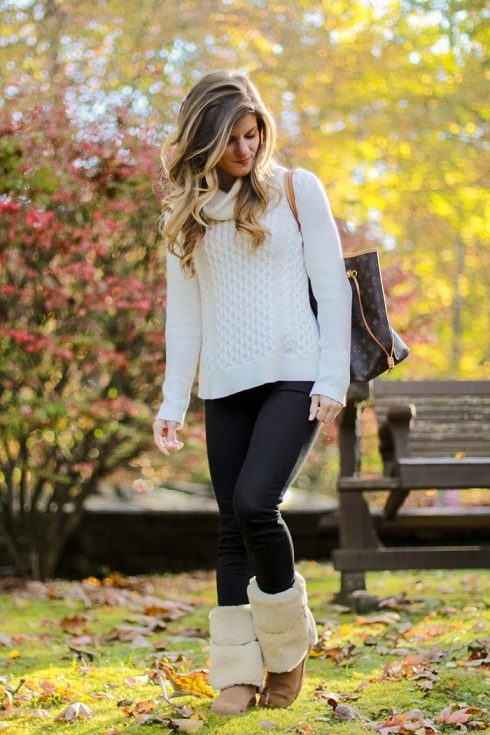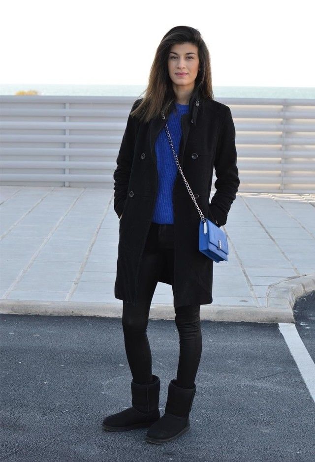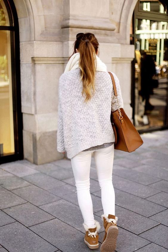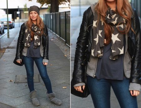 A backpack or bulk bag is perfect for completing a stylish look. Uggs harmoniously look in a tandem with a knitted hat and a scarf. On jeans you can wear a belt with a big buckle or pick a belt in a contrasting color. Uggs with fur trim visually divide the silhouette into two parts, so the emphasis on the waist line will help to cope with this problem.