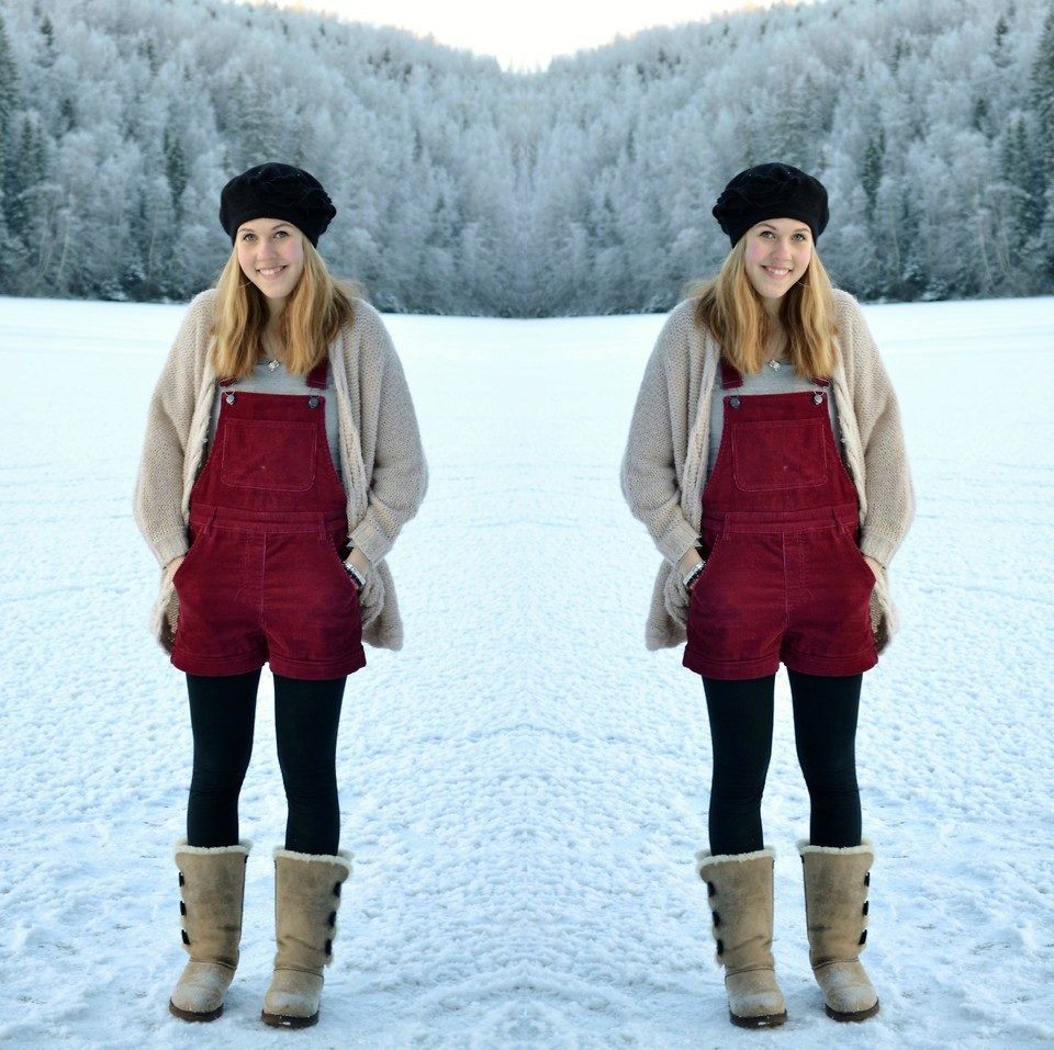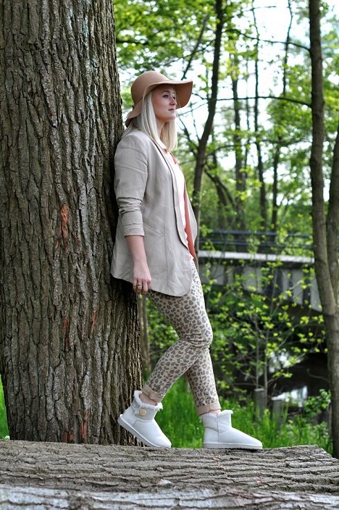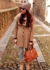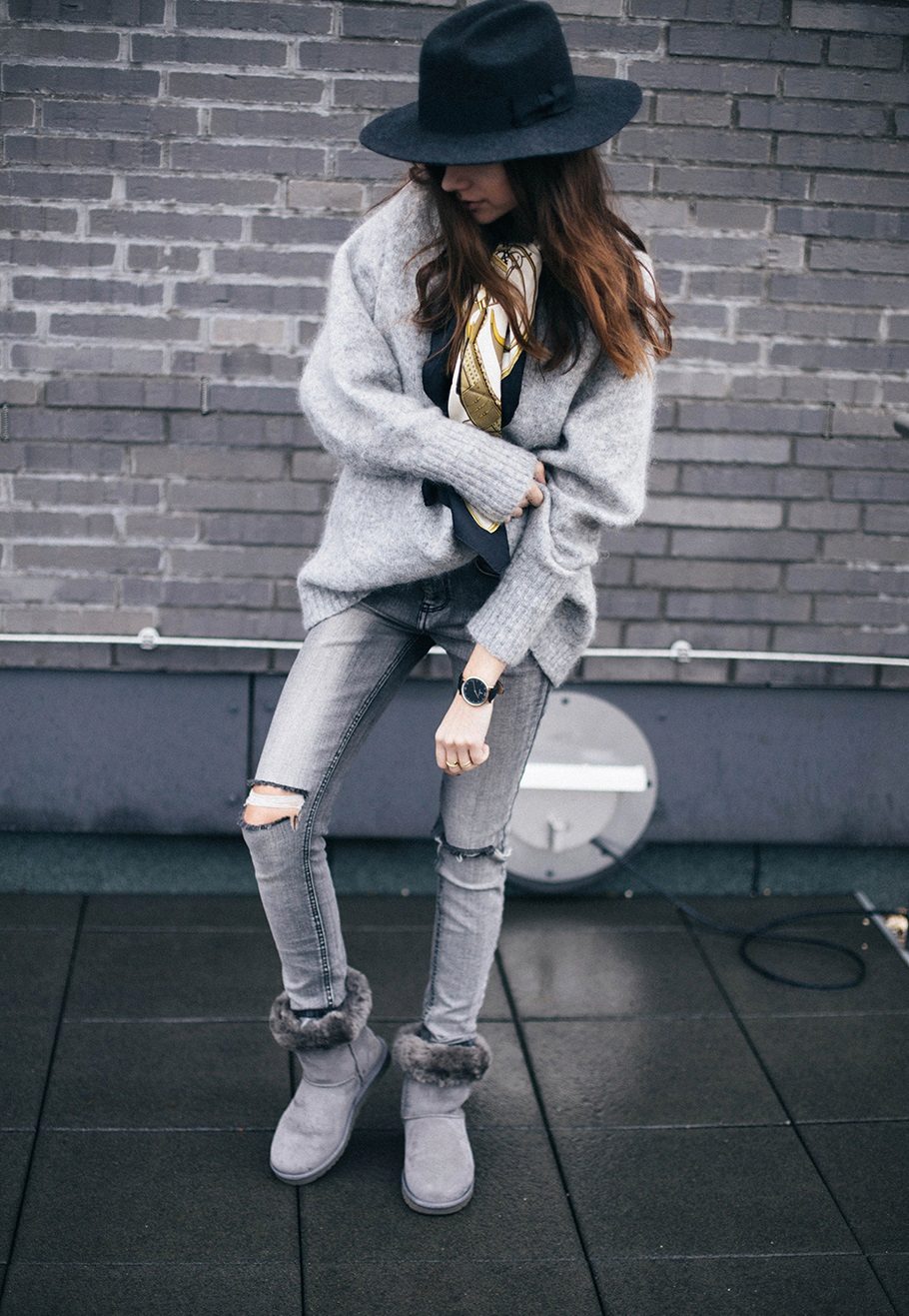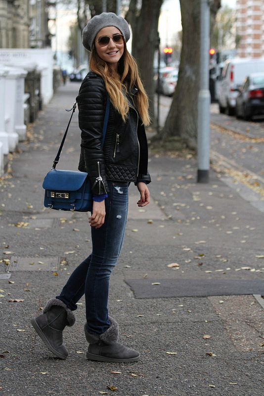 A backpack or bulk bag is perfect for completing a stylish look. Uggs harmoniously look in a tandem with a knitted hat and a scarf. On jeans you can wear a belt with a big buckle or pick a belt in a contrasting color. Uggs with fur trim visually divide the silhouette into two parts, so the emphasis on the waist line will help to cope with this problem.