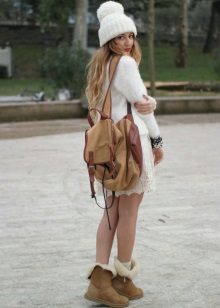 Uggs with fur in an ensemble with a long dress or skirt look ugly. For the embodiment of the romantic bow is better to give preference to feminine dresses knee-length or slightly higher. Also avoid clothing made of thick fabrics. A chintz with a floral print or chiffon will look inharmoniously in a tandem with massive uggs.