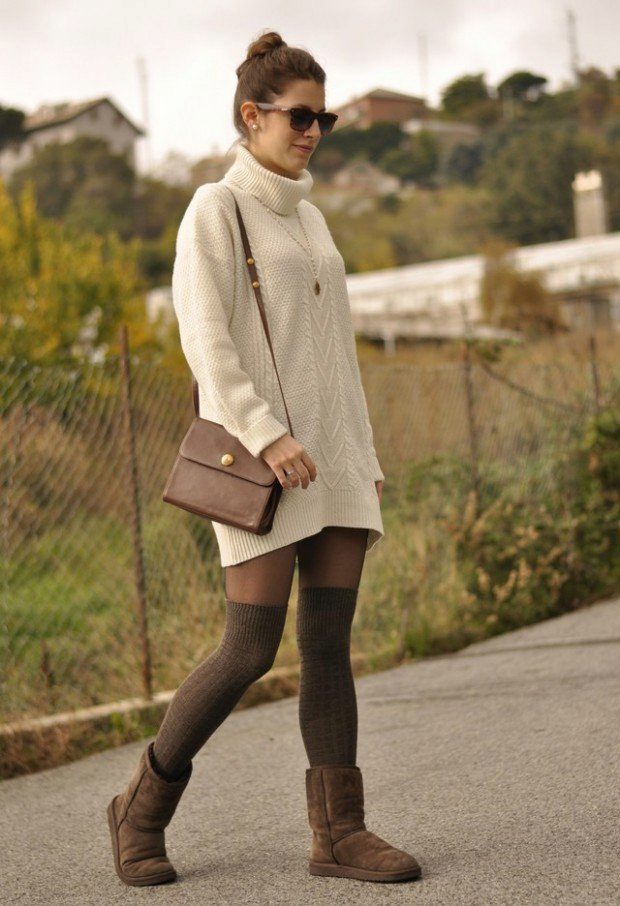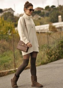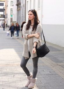 To create a bright, elegant bow, you can wear white or pink uggs. It should be borne in mind that such shoes are not bought for socks for every day, because it will quickly lose its original appearance.