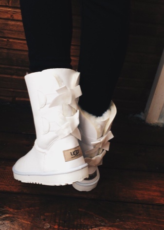 The most versatile and popular models are classic black and white. Such pairs will be perfectly combined with clothes in any color. The ensemble of black products with dark jeans will visually make ladies' legs more slim and long. White ugg boots will look very impressive and fresh with light trousers of blue or beige shade.