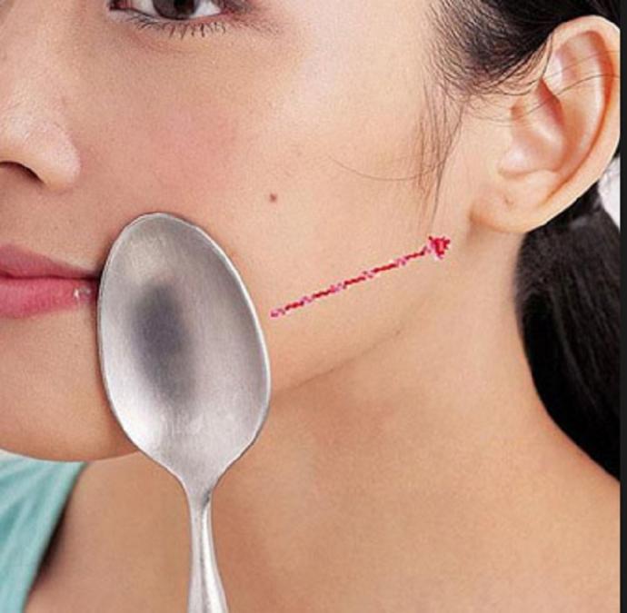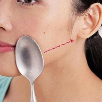 To improve the shape of the face, it is necessary to move the spoons towards each other in the direction from the chin to the ear. For better results, you can strain the muscles, but after the massage you need to remove the lymph. Correcting the chin, hot devices are placed horizontally under it, straining the muscles of the chin, and then pushing the cutlery to the side and upwards with a slight pressure.