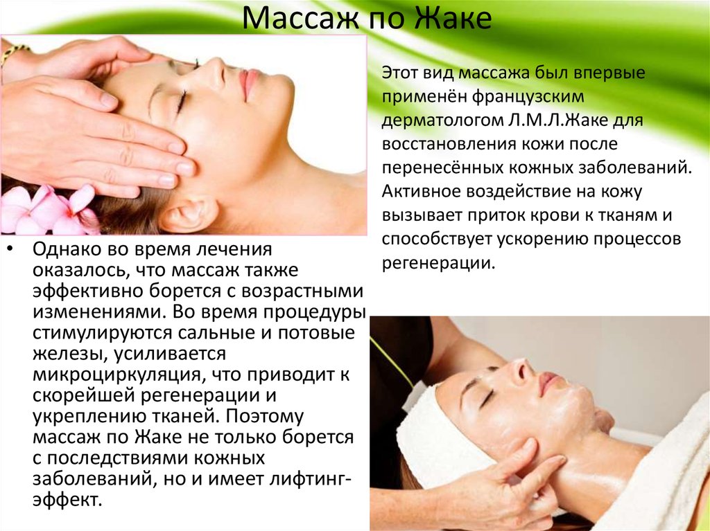 The Jacque massage technique on the face has now become widely used in beauty salons and medical clinics. In addition, such a process involving effects on massage lines is universally carried out not only on the face, but also on other parts of the body (back, hips, chest, buttocks).