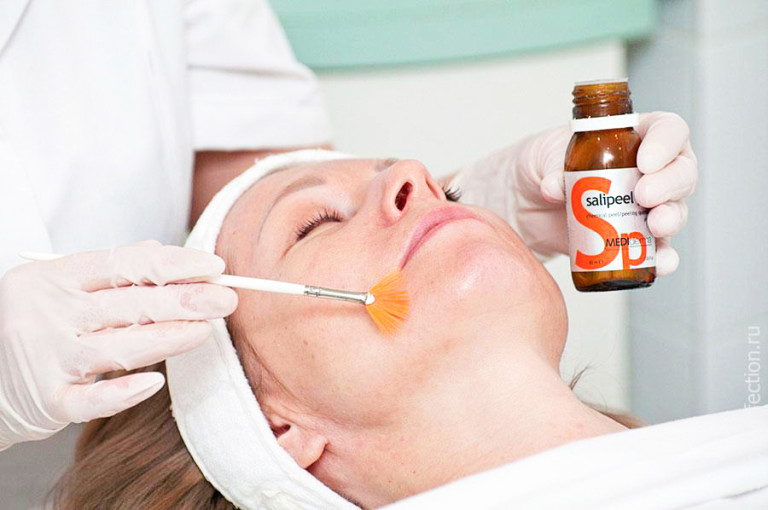 - Salicylic acid peeling. To do this, you need an acid in a concentration of 15-20%. It is applied to a clean face with a cotton pad or swab, it should be kept for about 20 minutes (not longer). After the specified time, the acid is washed off with plenty of cool water.