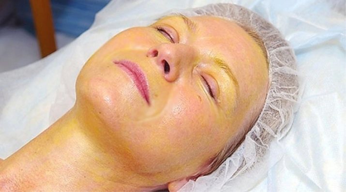 Another “color” peeling is yellow. It consists of a mixture of retinaldehyde, vitamin C and acids. First, the face is “prepared” with the help of a preparation based on glycolic acid in a concentration of 20 percent. Next, apply peeling with retinoids. Kojic and phytic acids remove pigment spots, azelaic acid, in turn, regulates the degree of oily skin and leads to the fight against free radicals. Collagen production is accelerated with vitamin C, and retinoic acid controls sebum secretion.
