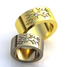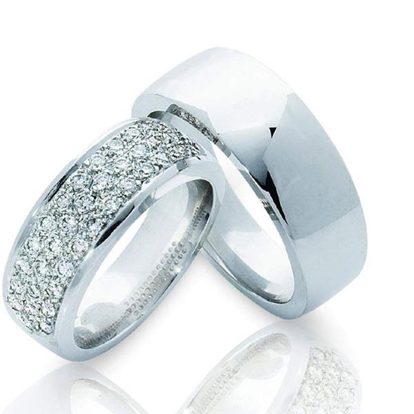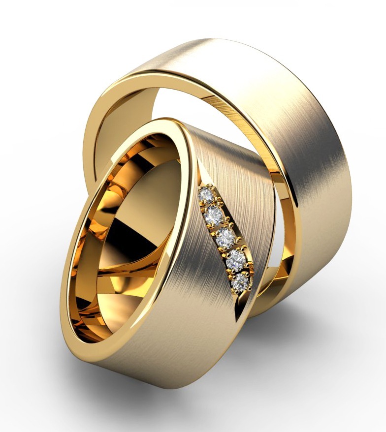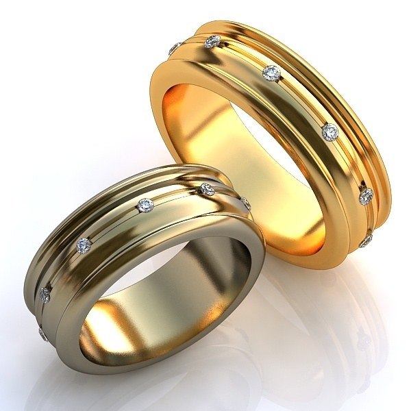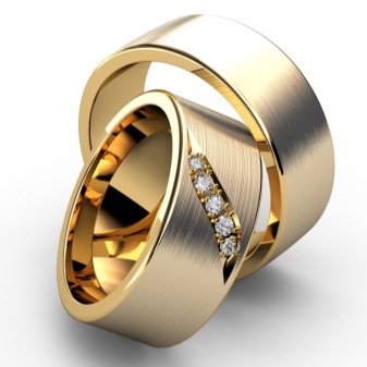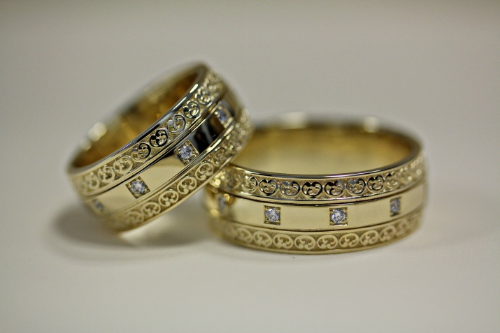 Products with diamonds choose about 50% of pairs. The reason for this is the fact that not all representatives of the stronger sex agree to wear rings with these shining pebbles. For such a case, there are models with carved or stucco decoration.