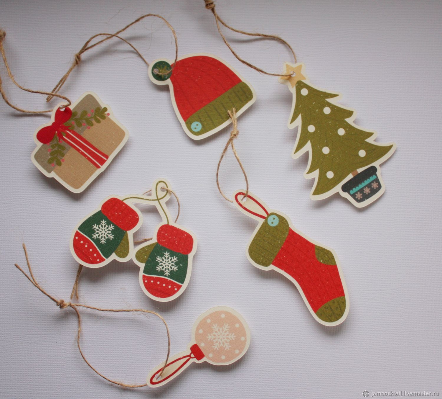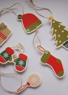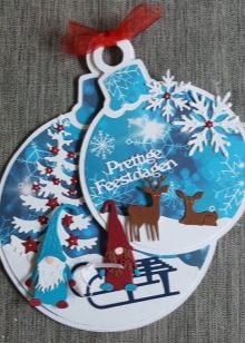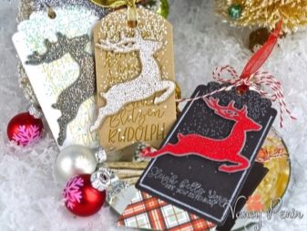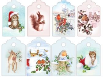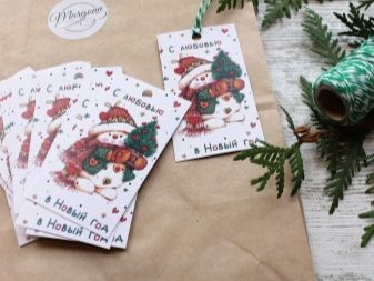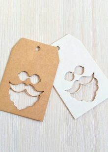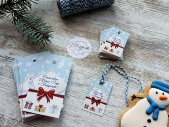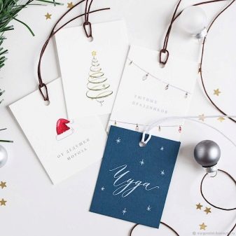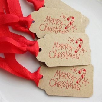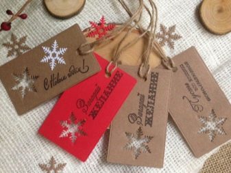 The form of the tag can also be associated with the person for whom it is intended. Christmas balls, bells and snowflakes are universal options. Kids labels can be made in the form of snowmen, bunnies, mittens. A humorous version of the add-on for the men's gift - a funny mustache.