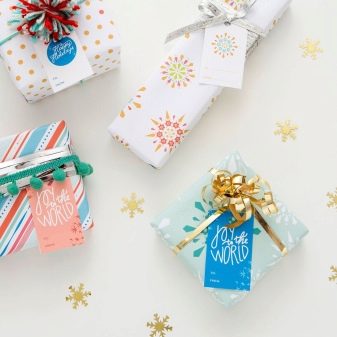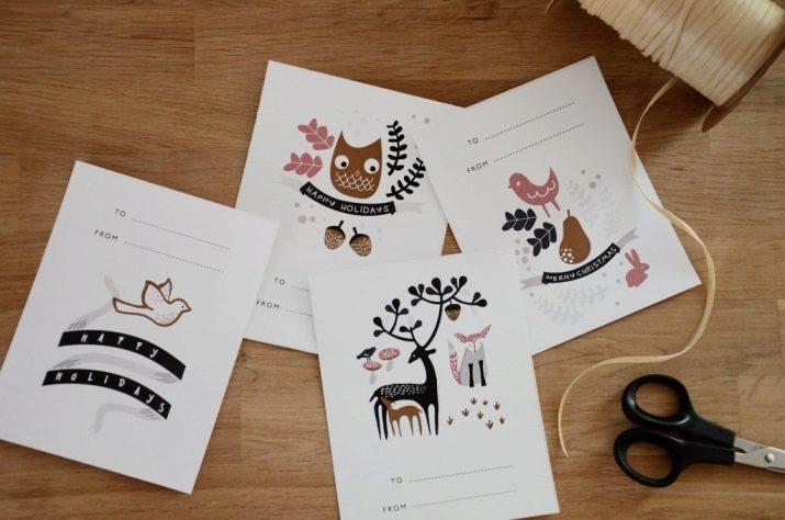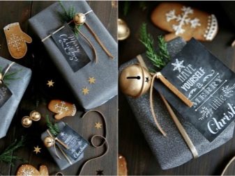 Children (and sometimes adults) gifts are often packed in bright paper. Here it is important to keep a balance. For example, if the package is decorated with a colorful print, a single-colored tag will suit it. If monochrome paper is selected, then it is permissible to add a tag with a pattern. This will not allow all elements of the decor to merge into an incomprehensible diversity.