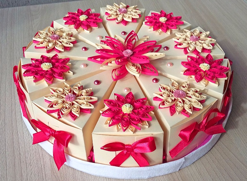 - "Sweet gift." Perfect in case your souvenir has several parts. Using scissors, cut out the workpiece, as shown in the diagram, and roll the material into three-dimensional triangles (cake pieces), then lay out on a plate and decorate.