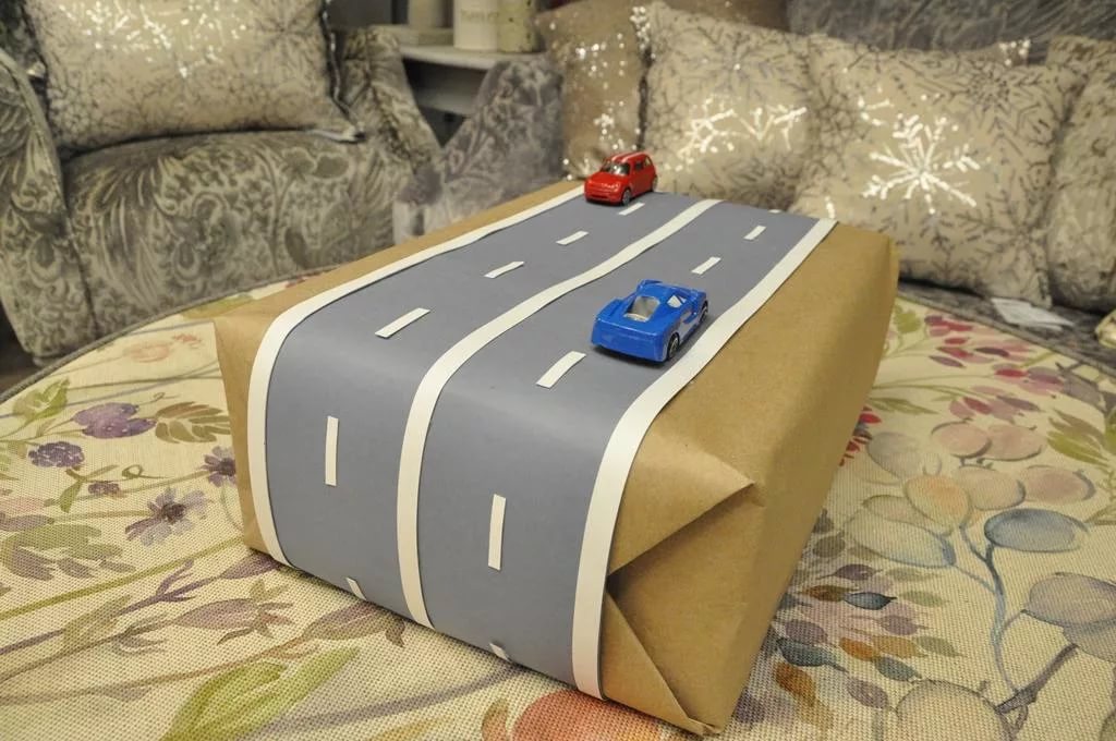 - Kraft paper and a small toy machine, attached to the tape depicting the road, will delight the motorist.