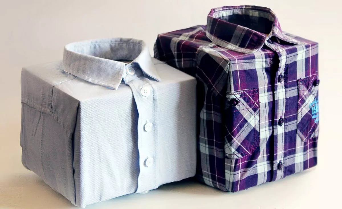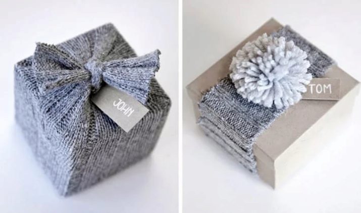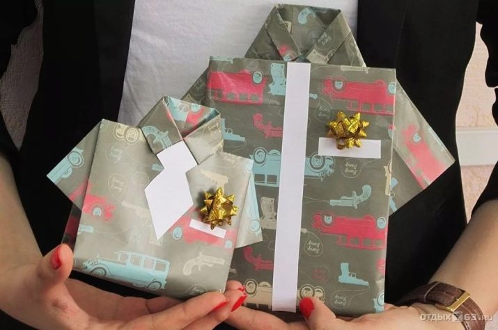 - A gift wrapped in a men's shirt or sweater looks unusual. Put the shirt on the square box in which the gift lies, button buttons, tuck the sleeves down and pin down with pins.
