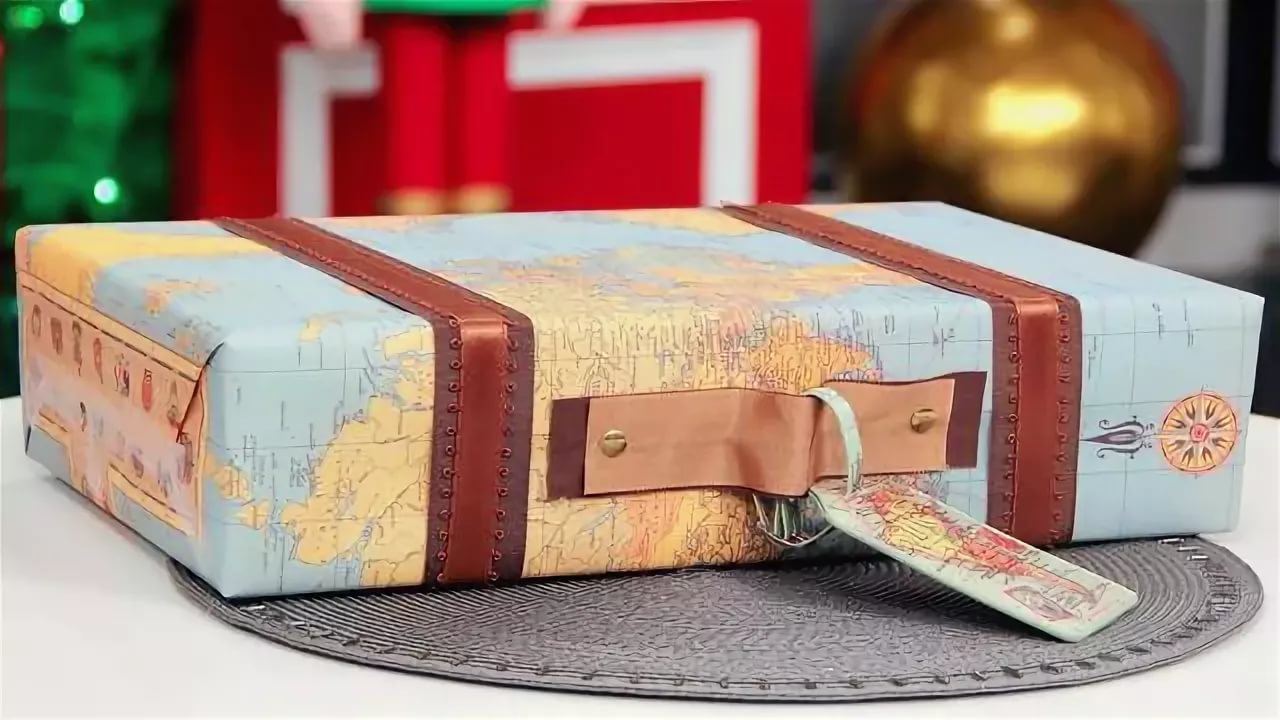 - A real traveler will appreciate the packaging made from paper printed in the form of sights or countries or from a map of the world (or you can use unnecessary atlases for children). As a decoration, you can add an airplane figure.