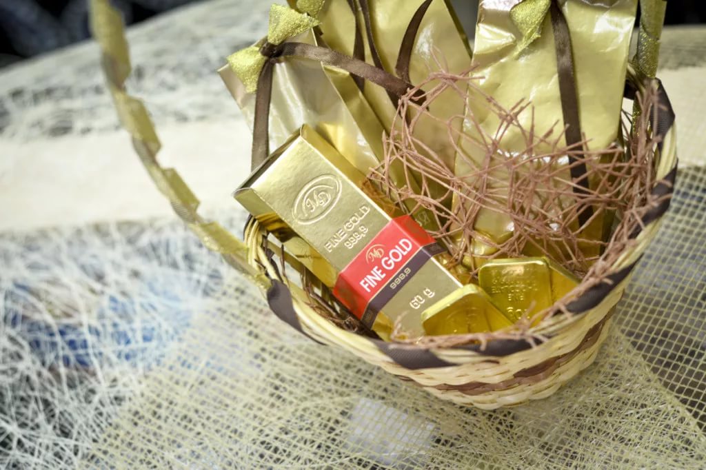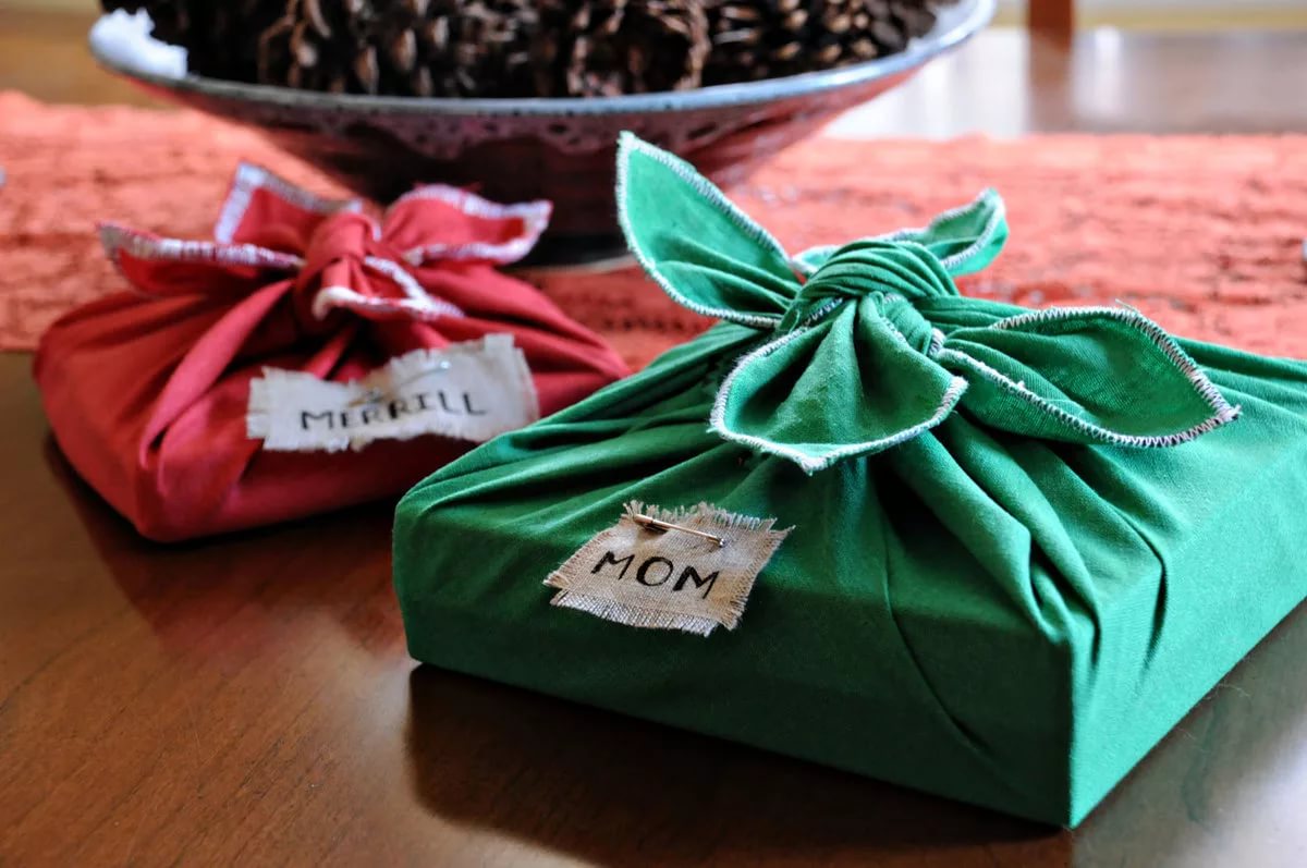 - Creatively looks gift in a bundle. This is a Japanese furoshiki technique. A gift is wrapped in a square piece of bright and sturdy fabric and knotted on top.