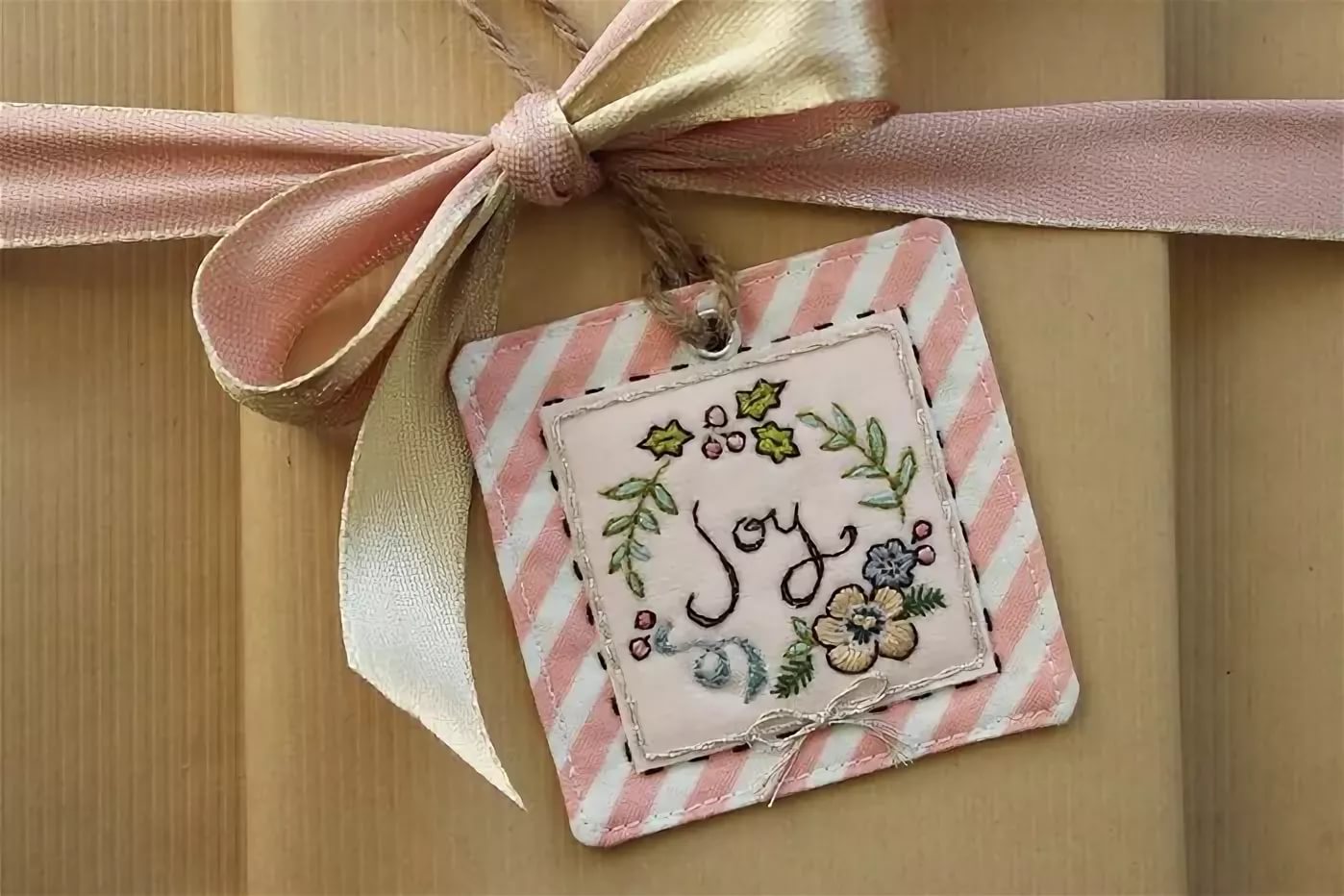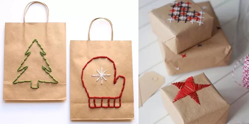 - You can embroider a greeting or a decor element on wrapping paper. A good idea is to use a sewing machine and stitch a gift in craft paper (the packaging can be in the shape of a star, a Christmas boot, a car, etc.).