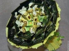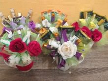 - The floristic net and wire, wooden sticks for fastening sweets, sisal, beads will become additional materials for creating a bouquet.