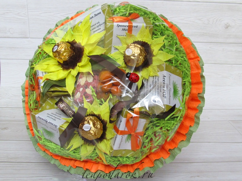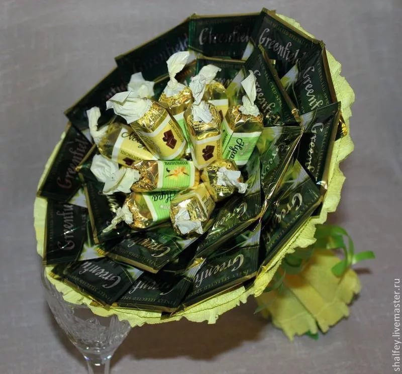 - The center of the composition can be filled with your favorite sweets: candies, muffins, muffins, cookies, chocolate.