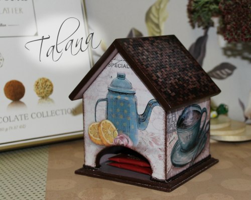 - Looks very nice tea house for tea bagsThe donor will present in an elegant, transparent package. Such a gift will be very pleasant for a close relative, who will be happy to use it, remembering you with a kind smile.