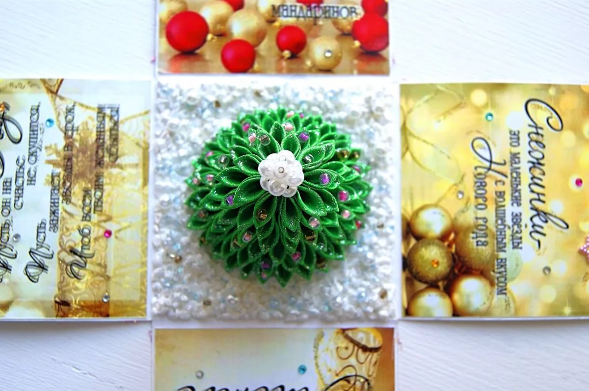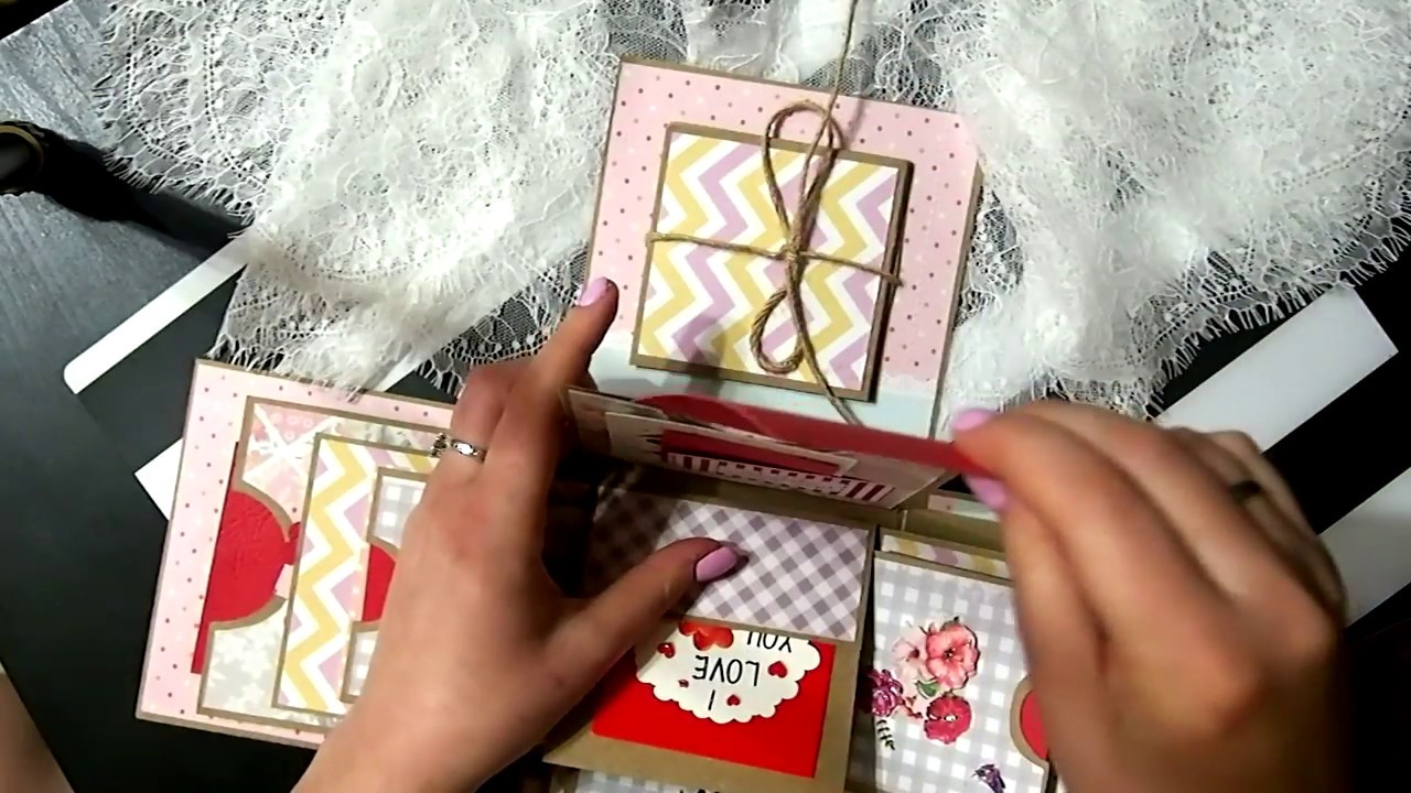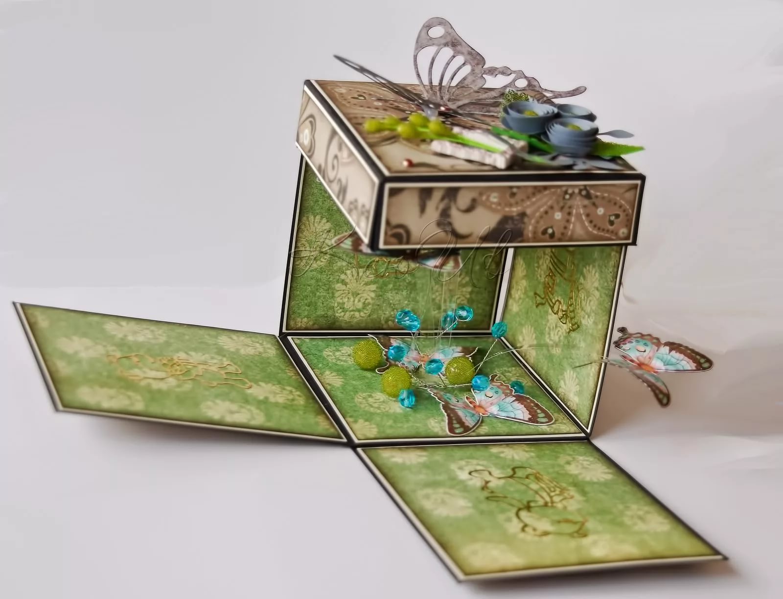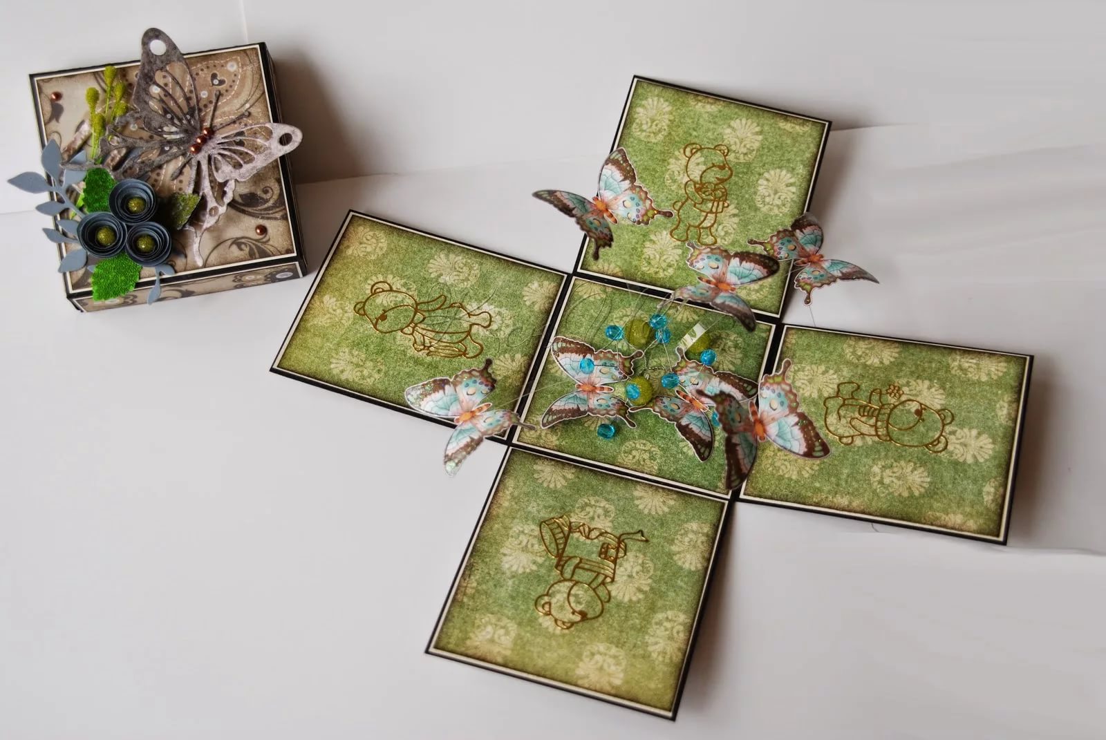 Composing the original box, you can apply a more complex structure. So, when removing the cover, the base will be decomposed into 4 main parts, and each side will open separately into several additional sections. And in each department you can arrange pictures with wishes, notes and any miniature items.