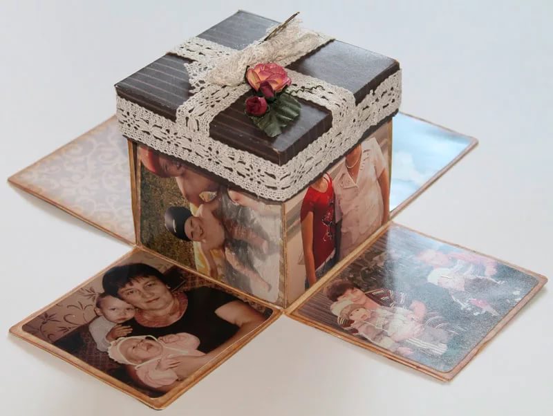 Creating an original box with a surprise, many can get lost in the ideas and assumptions about how and what to place inside the craft. In addition to the standard gift, the inner sides of the decorative packaging should be decorated with special elements. For example, memorable photos or miniature objects that remind the recipient of the bright emotions of the past days.