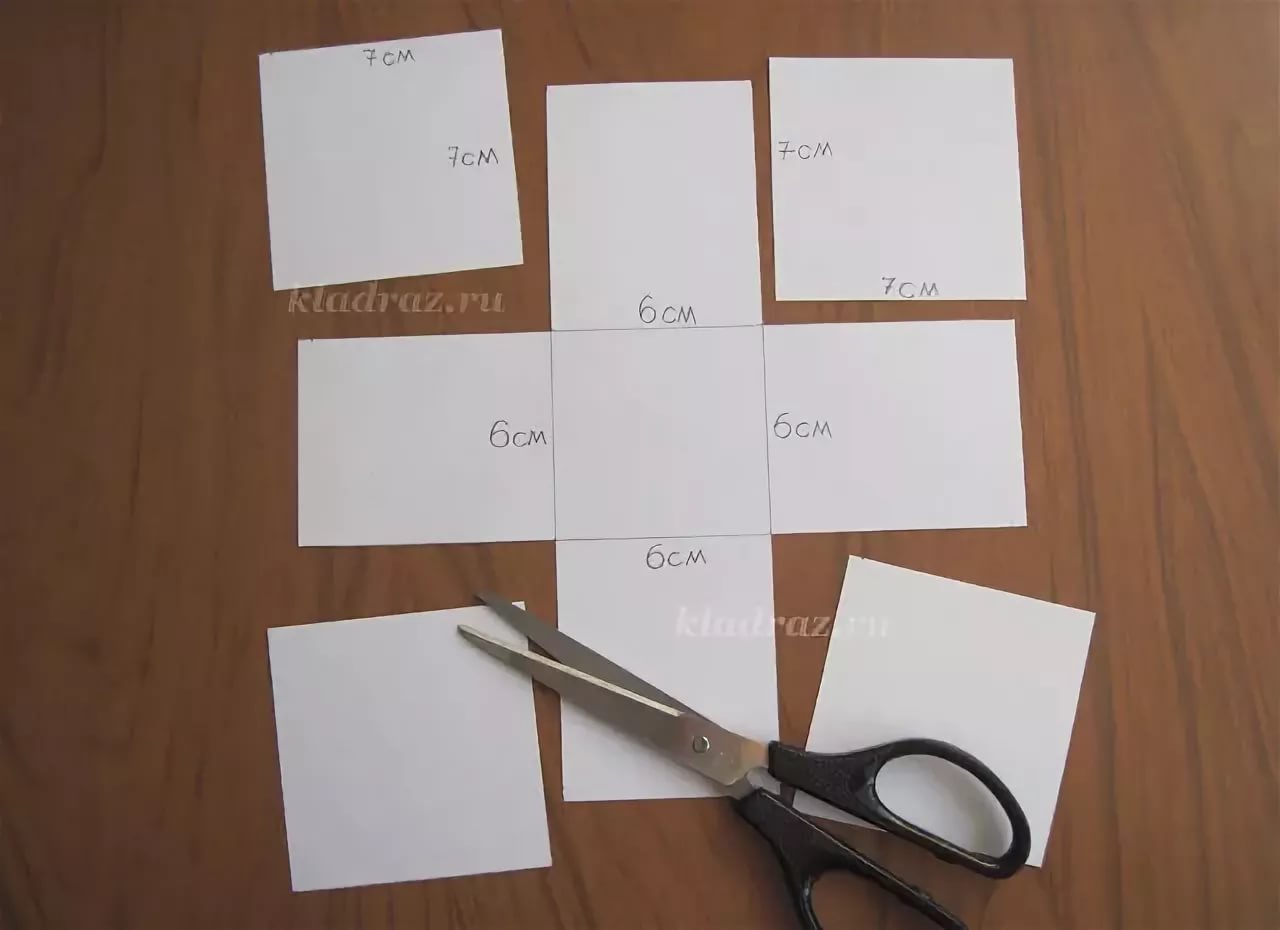- Next, it is necessary to cut out 6 squares of scrap paper with side lengths corresponding to the prepared cross, that is, 9 cm. Five squares will be used immediately, the sixth figure will lie idle for a while.
