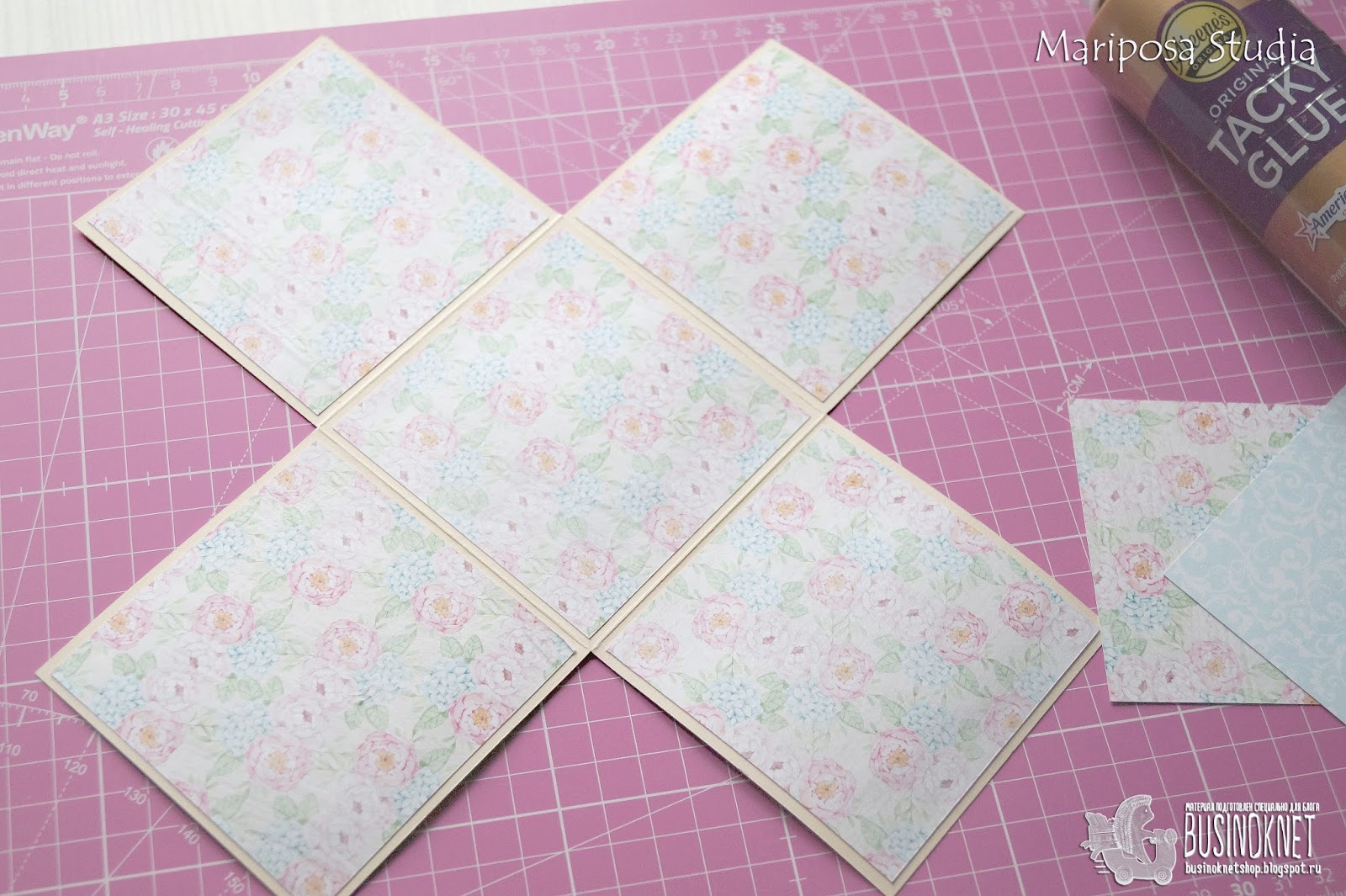 After making the inside of the box you need to make a cover. To do this, you need to cut out thick paper, and preferably from a sheet of drawing paper, a square, each side of which is 11 cm. Inside, draw a square figure of the base, 9 cm. and on top stick the remaining decorative sheet of scrap paper square.