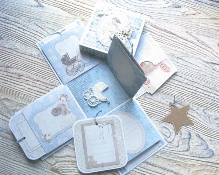 Quite an interesting way to congratulate young parents with replenishment. The color palette must match the floor of the newborn. In the center of crafts, it is appropriate to portray the image of the stroller, glue postcards with wishes along the side walls, leave space for entering data about the baby born.