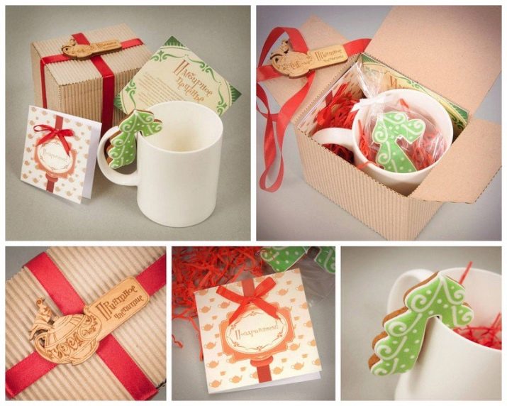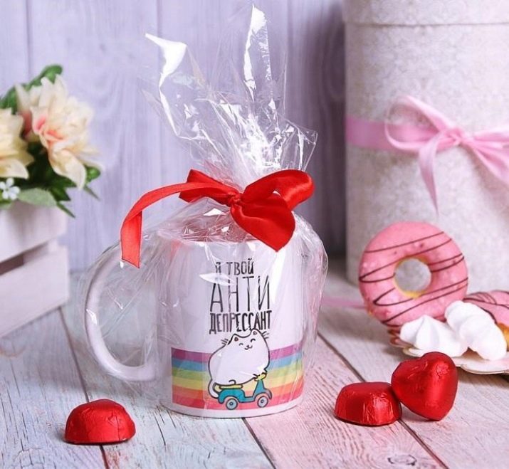 A holiday mug can be presented without any external packaging. However, in this case, you need to take care of its internal content. It should be selected on the basis of personal preferences of the person to whom your gift is intended. For example, a sweet tooth will like sweets and chocolates, in the New Year it is appropriate to fill a cup with tea bags and coffee.