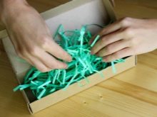 Making a decorative filler for a gift box is easy. For this you need working materials and free time. If you need to do it quickly, preference should be given to organze filler. It does not need to be cut into small pieces, but it is enough to lay it at the bottom of the box, and then wrap the present itself with it. At will such registration can be decorated with a simple decor.
