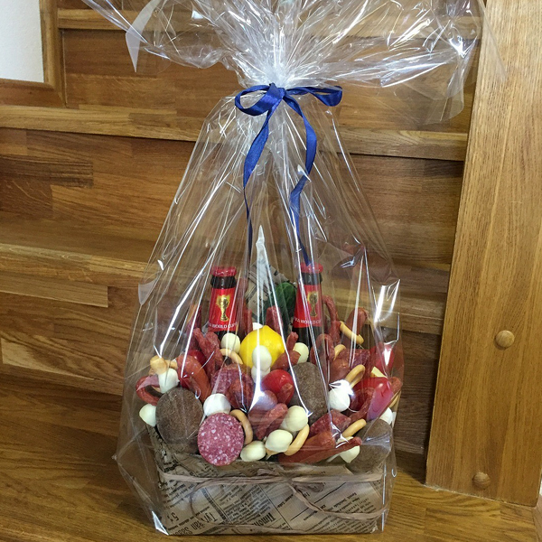 A transparent plastic bag is required to closely adjoin things. It is very important. Also, the appearance of the wrapper will serve as a model of a pyramid, a giant candy or crackers. It all depends on your imagination and surprise form.