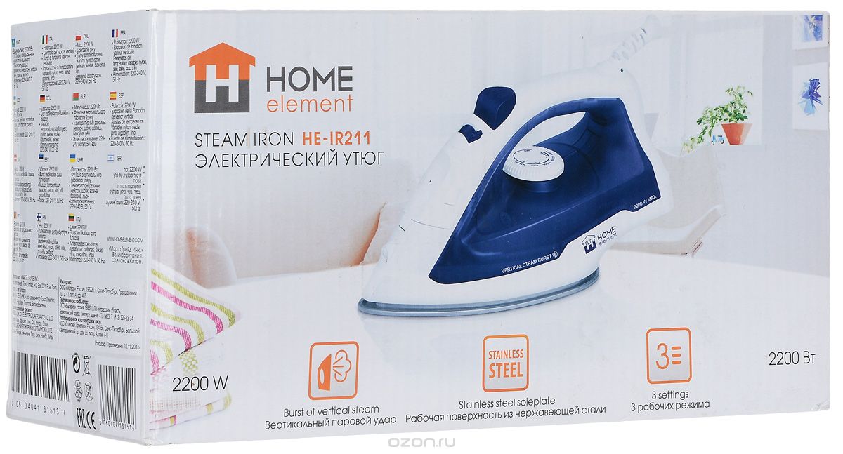 The very same budget model of the possible - Home Element HE-IR212 Blue Aquamarine, its minimum cost starts from 499 rubles. The model has all the necessary functions for ironing, has a spherical attachment of the cord and can even steam things vertically.