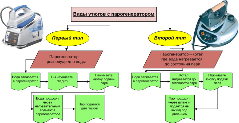 There are several types of irons: simple or with a steam generator. Now even the cheapest irons can have the function of splashing and steam. Special irons with a steam generator are also divided into two types: with a built-in steam generator or a separate one.