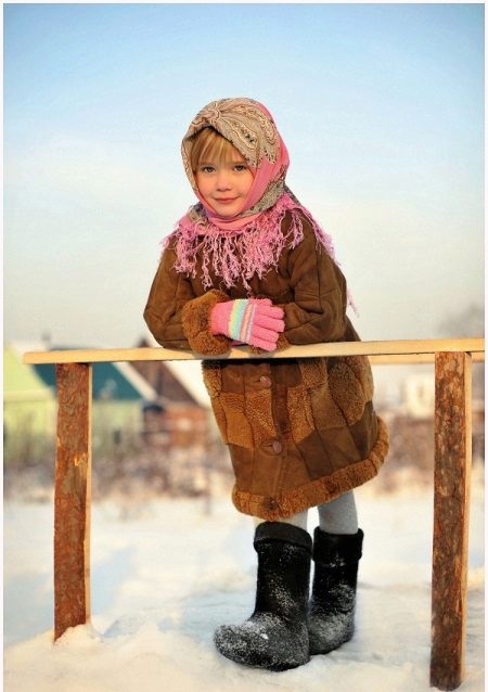 Stylish winter ensemble for a little fashionista. A pretty sheepskin coat of universal length to the knee of a pleasant honey shade has an original decor - fur inserts of the same shade, including cuffs on sleeves. A remarkable addition to outerwear are high boots with a lapel. Made in an elegant black color, they are like a reduced copy of an adult model. The color of the boots is set off by light gray tights. The highlight of the image is a scarf with a long fringe in the Russian folk style. His gray-pink color scheme refreshes the girl's face and the entire outfit, combining color with gloves.